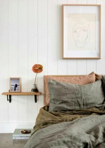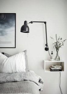 - Hängeregale aus Kunststoff, Metall oder Holz (abhängig von der ursprünglichen Einrichtung des Schlafzimmers). Sie können direkt über dem Bett aufgehängt oder unter die Seite gestellt werden - gerade an der möglichen Stelle für einen Nachttisch. Von den Vorteilen dieser Ersatzoption kann man die bequeme Platzierung und die Nachteile wiederum die Notwendigkeit feststellen, die Wand zu beschädigen.