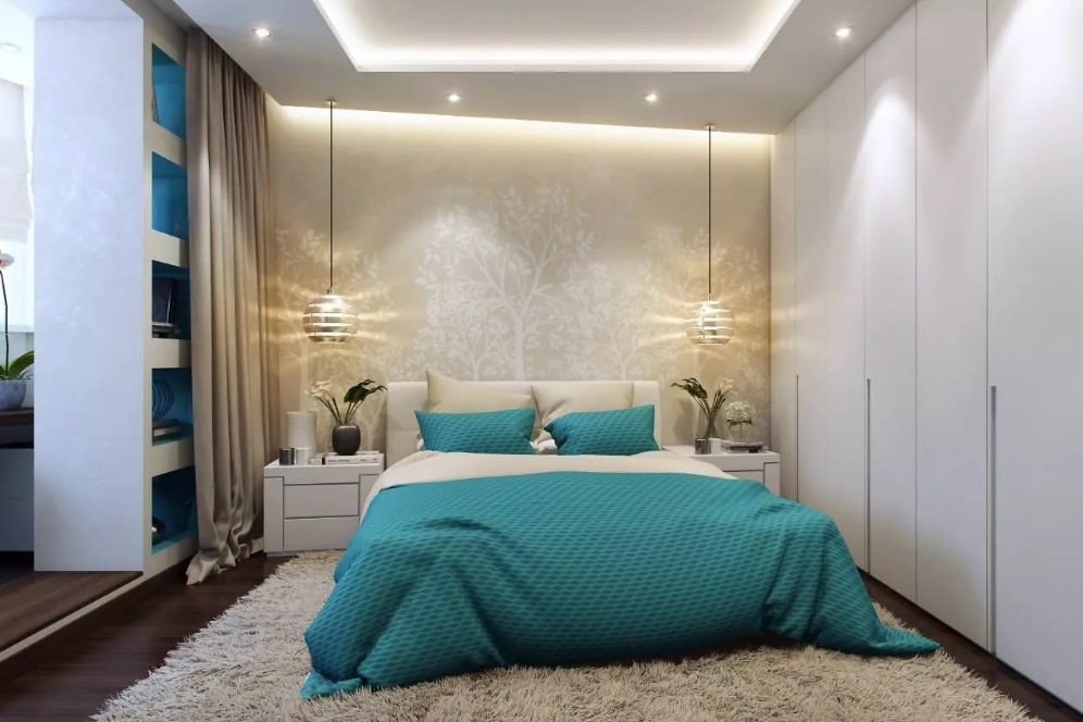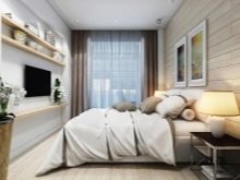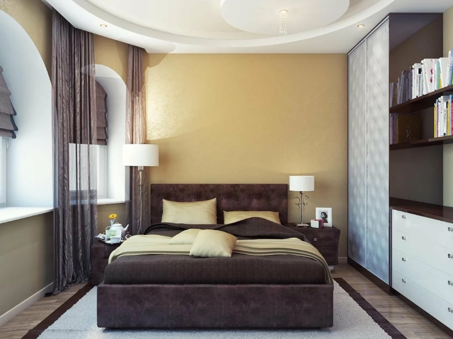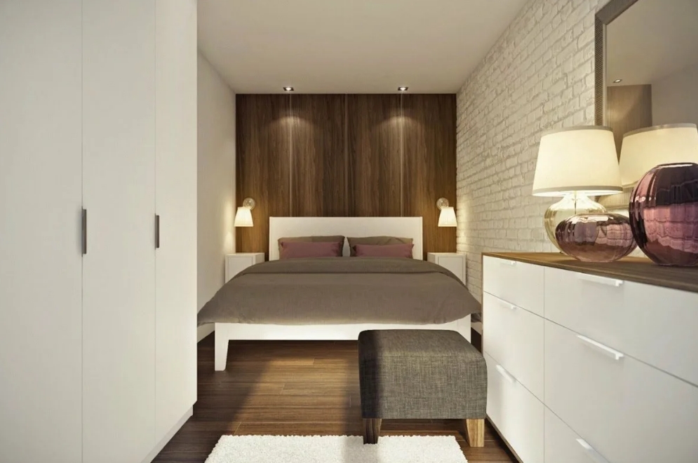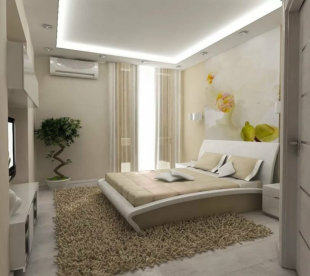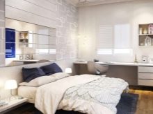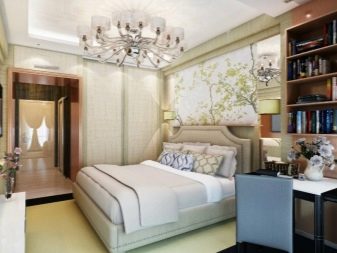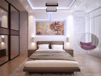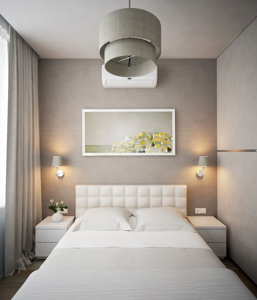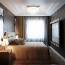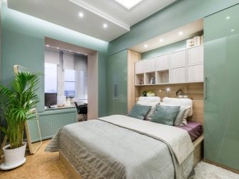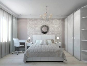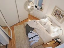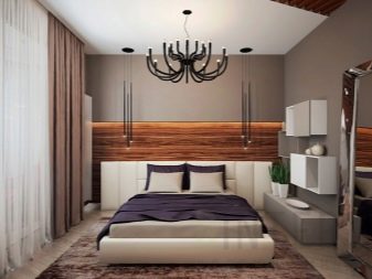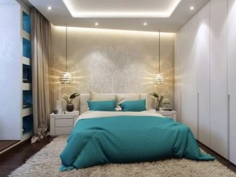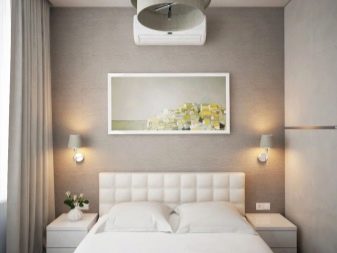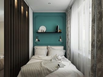 Es scheint nur, dass all diese Nuancen zweitrangig sind. Schon ein einzelner Kronleuchter kann die Wahrnehmung des Layouts und den Komfort des Schlafens und Entspannens beeinträchtigen. Sie können Möbel in einem Projekt nicht dicht aneinander anschließen, selbst wenn nur sehr wenig Platz vorhanden ist. Passagen sollten noch bleiben, die Anordnung von Möbeln und Designerdekorationen ist am besten, wenn der Raum in 2 Abschnitte unterteilt wird.