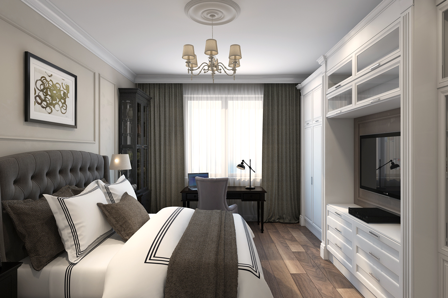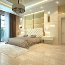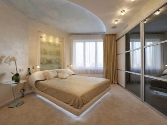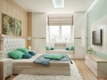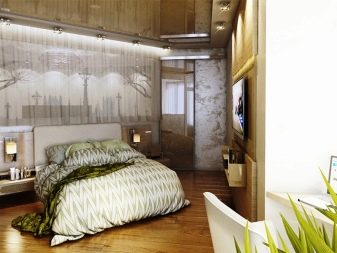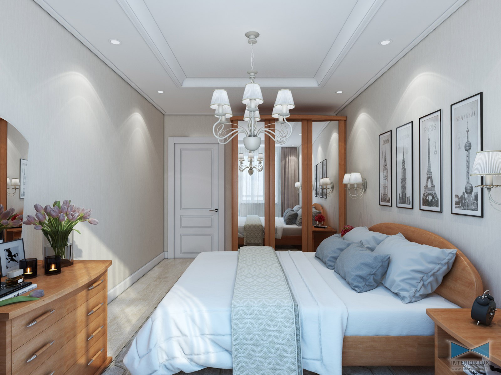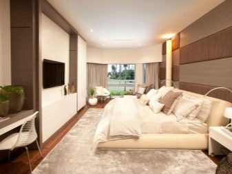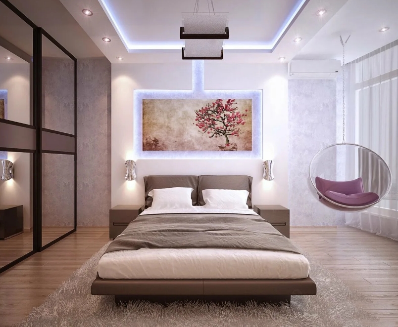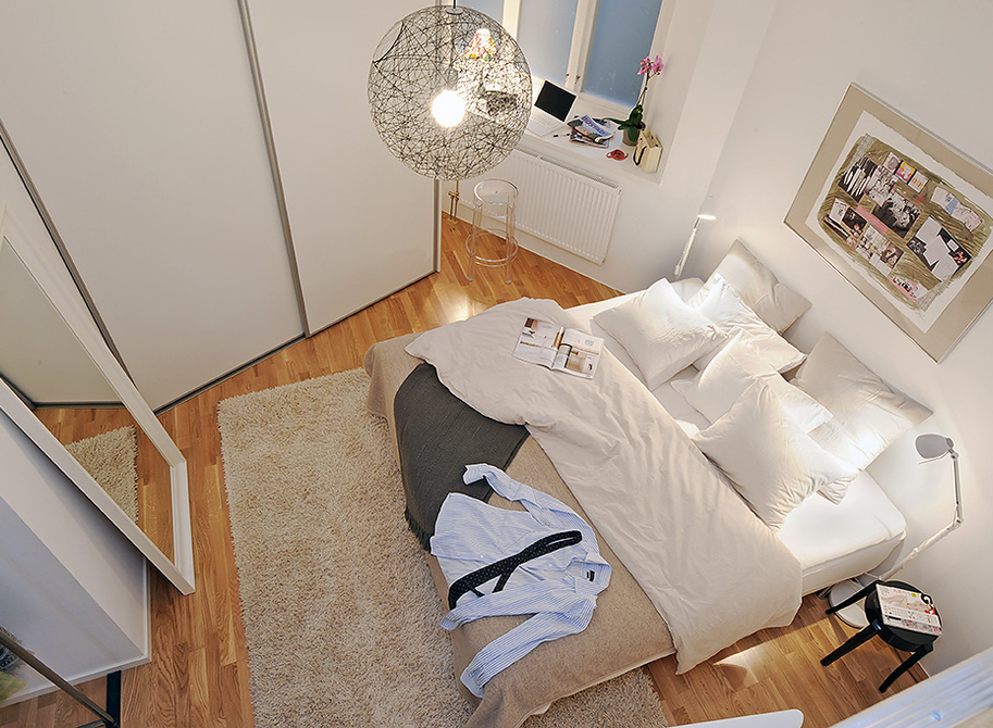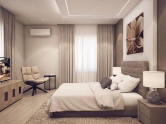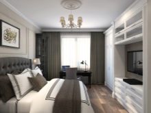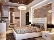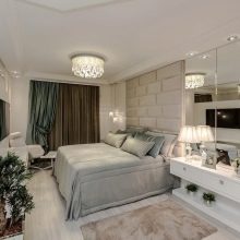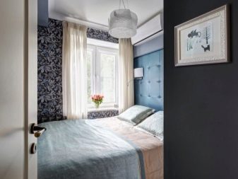 Es scheint nur, dass all diese Nuancen zweitrangig sind. Schon ein einzelner Kronleuchter kann die Wahrnehmung des Layouts und den Komfort des Schlafens und Entspannens beeinträchtigen. Sie können Möbel in einem Projekt nicht dicht aneinander anschließen, selbst wenn nur sehr wenig Platz vorhanden ist. Passagen sollten noch bleiben, die Anordnung von Möbeln und Designerdekorationen ist am besten, wenn der Raum in 2 Abschnitte unterteilt wird.