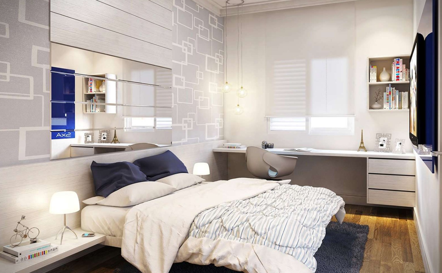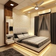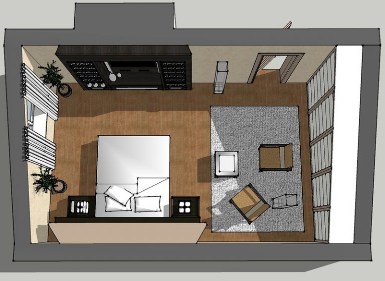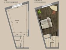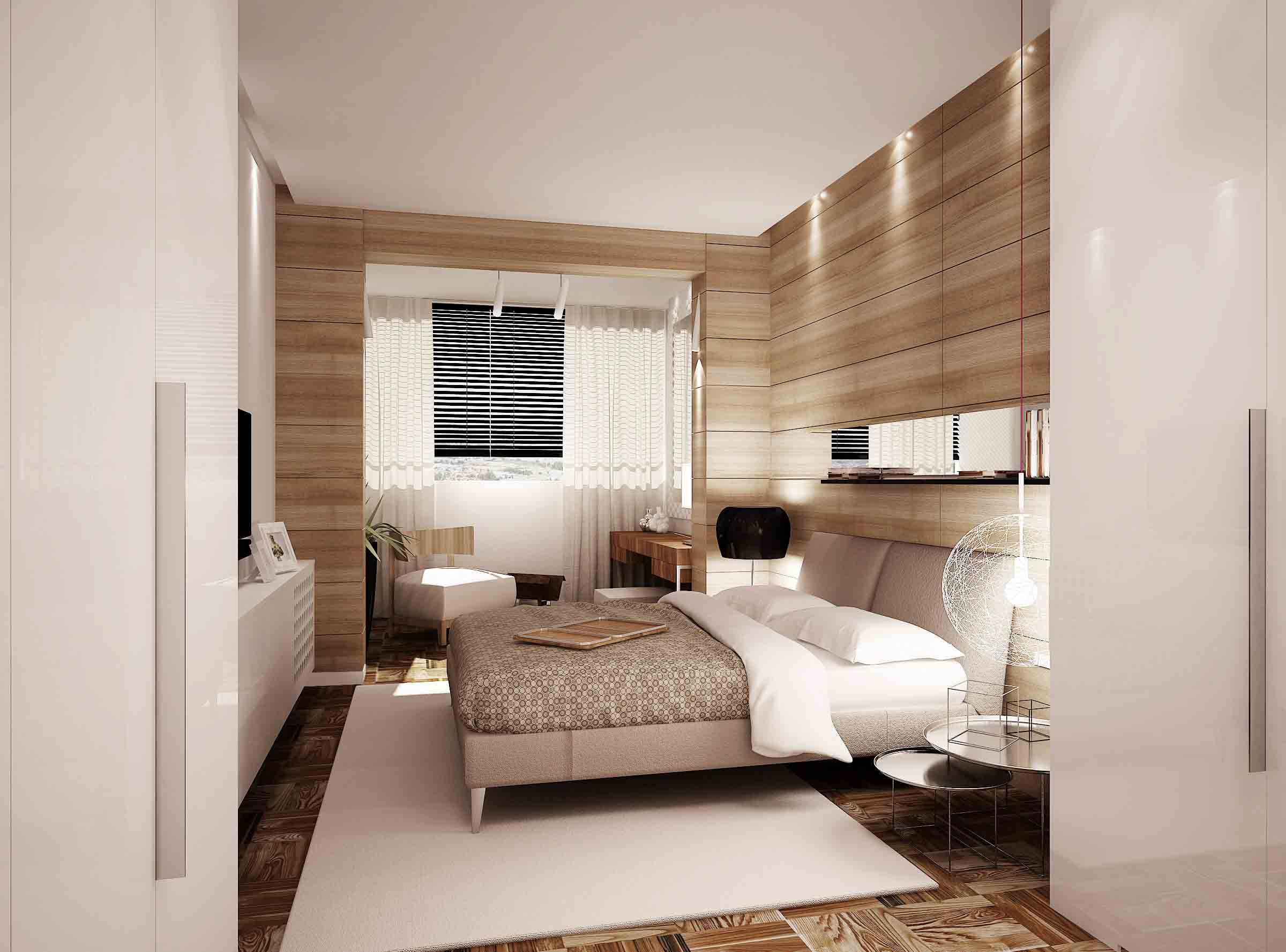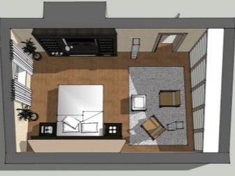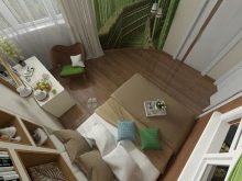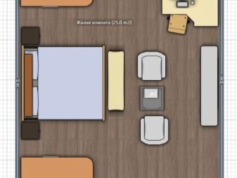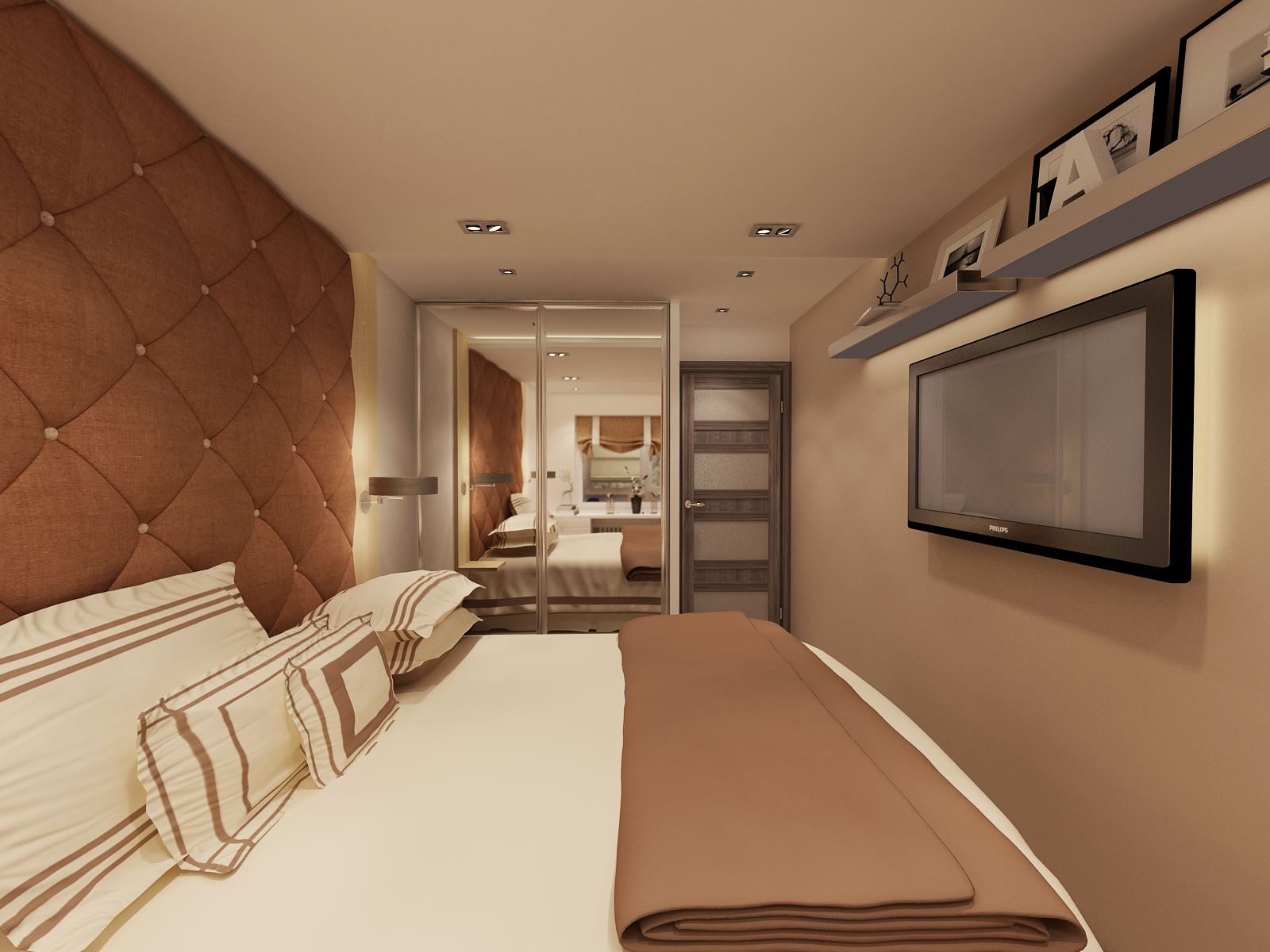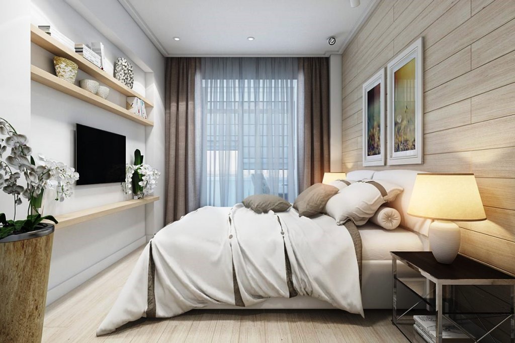 Es scheint nur, dass all diese Nuancen zweitrangig sind. Schon ein einzelner Kronleuchter kann die Wahrnehmung des Layouts und den Komfort des Schlafens und Entspannens beeinträchtigen. Sie können Möbel in einem Projekt nicht dicht aneinander anschließen, selbst wenn nur sehr wenig Platz vorhanden ist. Passagen sollten noch bleiben, die Anordnung von Möbeln und Designerdekorationen ist am besten, wenn der Raum in 2 Abschnitte unterteilt wird.