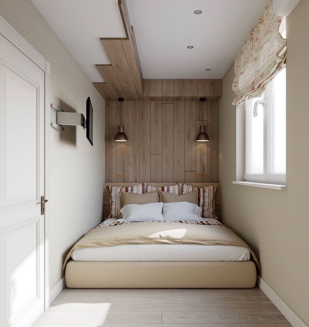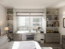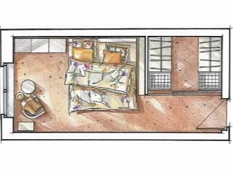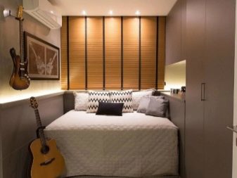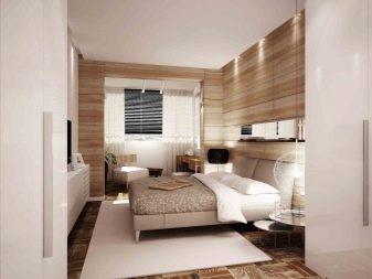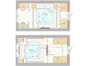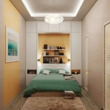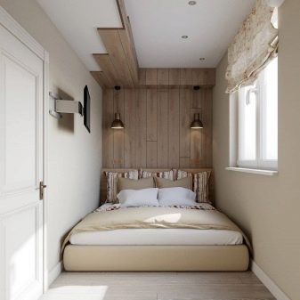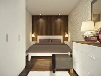 Die Besitzer des Studio-Schlafzimmers fühlen sich wohl - was man nicht von denen sagen kann, die längliche Räume nutzen müssen. Auch hier empfiehlt es sich, auf alles Überflüssige zu verzichten und nur Bett und Kleiderschrank zu belassen. Doppelbetten müssen meist in die Ecke geschoben werden. Es ist einfach unmöglich, einen anderen Ort für sie zu finden. Der Ausweg liegt jedoch auf der Hand - ein eineinhalb Modell zu kaufen oder einen verwandelnden Schlafplatz auszustatten.
