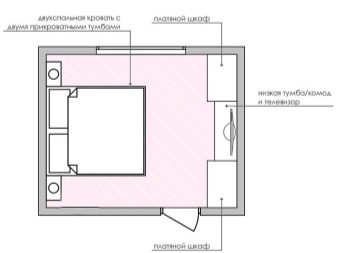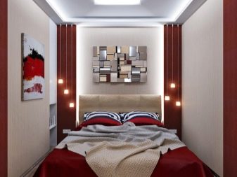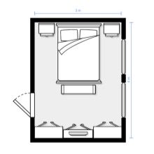 Die Größe der Schlafzimmer kann in verschiedenen Apartments variieren. Wenn es 2x3 m groß ist, bleibt nur das Bett mit dem Kopf auf die kurze Fläche oder die Seite auf die lange Fläche zu stellen. Von einem Kabinett kann keine Rede sein. Stattdessen hängen sie Schränke auf oder verwenden ein Gestell. Nachttische sind an den Seiten platziert.