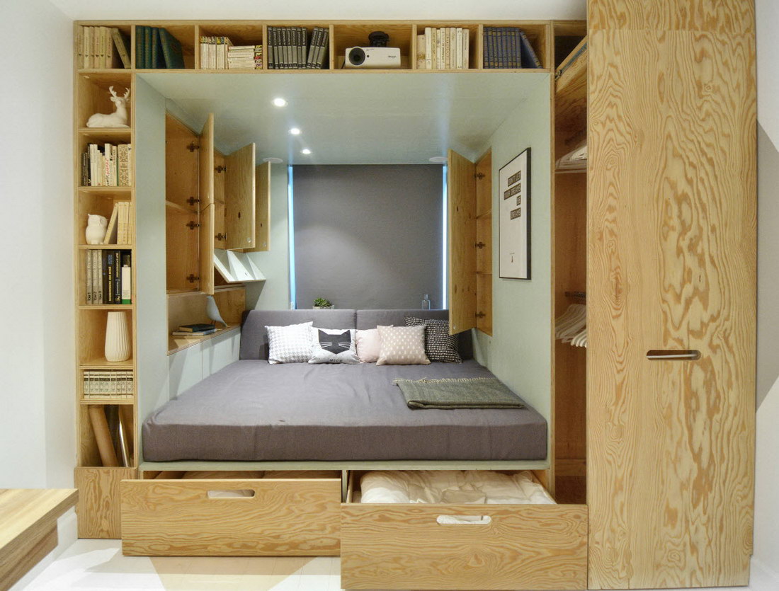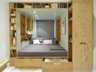 Der Zugang zum Schrank ist nach Möglichkeit breiter als alle anderen Gänge - mindestens 0,9-1 m Die Wahl zwischen einem Schiebeschrank und einem einfachen Kleiderschrank hängt nicht nur vom Platz, sondern auch von den persönlichen Bedürfnissen ab. Um Nischen kompetent auszustatten, empfiehlt es sich, für diese maßgeschneiderte Möbel zu kaufen. Platzeinsparungen können durch den Kauf eines Bettes mit Wäscheschubladen erzielt werden.