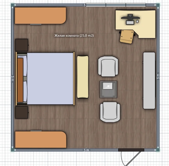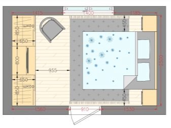 in Schlafzimmern 2x5 Sie müssen den gleichen Grundriss wie im 2x3-Raum verwenden, nur indem Sie zusätzlich einen Erholungsbereich organisieren.