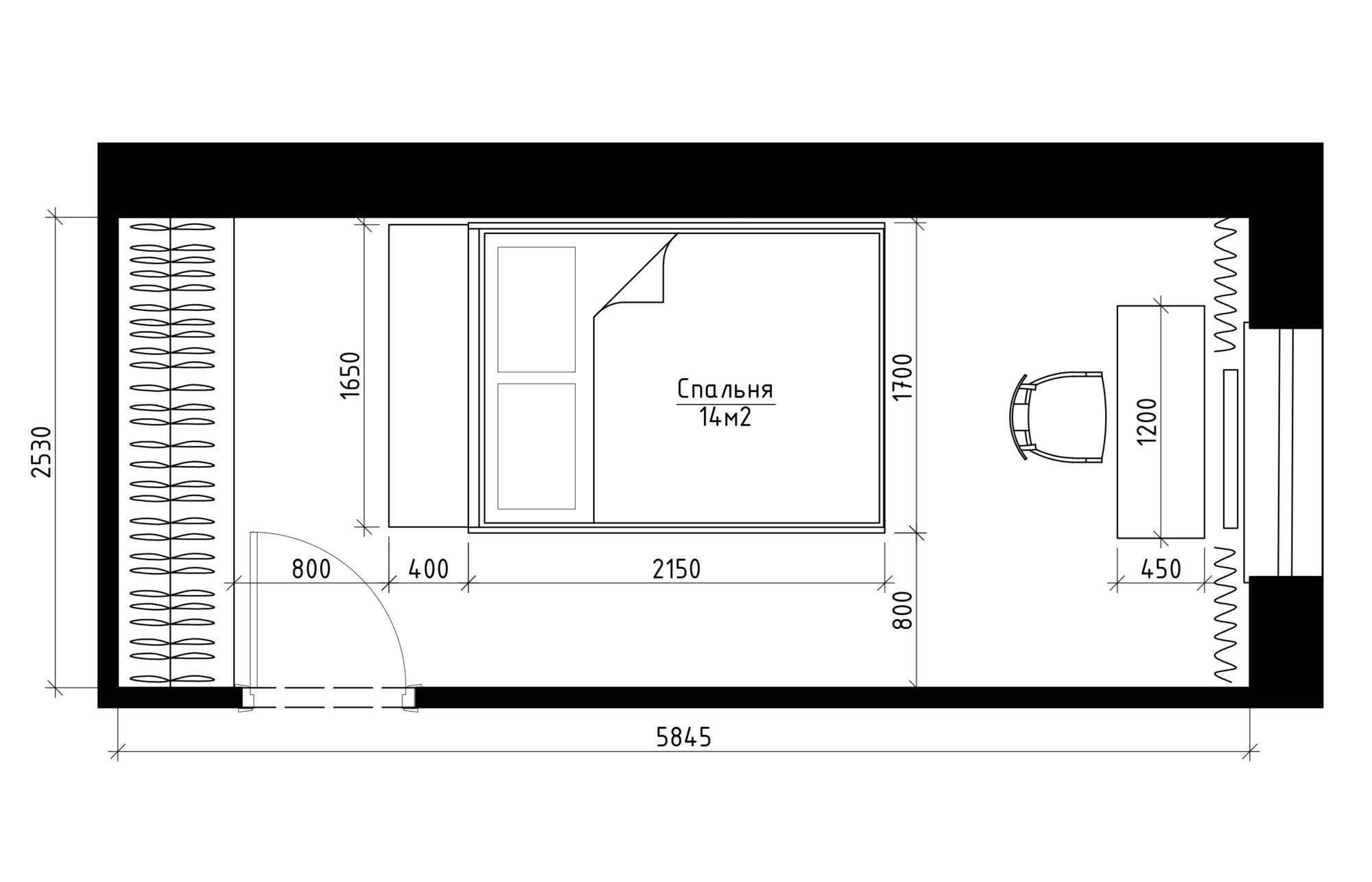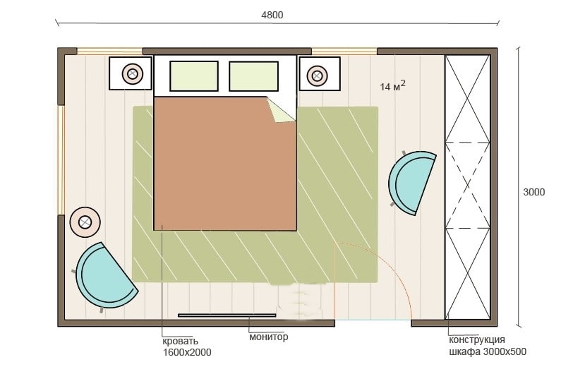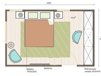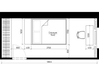 Das richtige Konzept für die Anordnung von quadratischen Räumen besagt, dass es nicht ganz sinnvoll ist, Symmetrie anzustreben. Wenn dies erreicht werden kann, dann nur beim Einbau zusätzlicher Möbelstücke, was nicht immer möglich ist. Bei jeder Gelegenheit lohnt es sich, große Schränke oder eine Auswahl mehrerer Möbelstücke zu kaufen – was mit einer Fläche von 14 qm gerechtfertigt ist. m) Das Bestreben, die Größe des Bettes zu reduzieren, um zusätzliche Möbel hineinzuquetschen, ist ehrlich gesagt unvernünftig. Wenn sie den Schrank ablehnen, müssen Sie eine beeindruckende Umkleidekabine ausstatten.