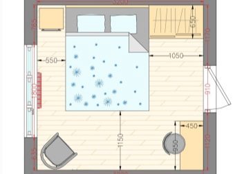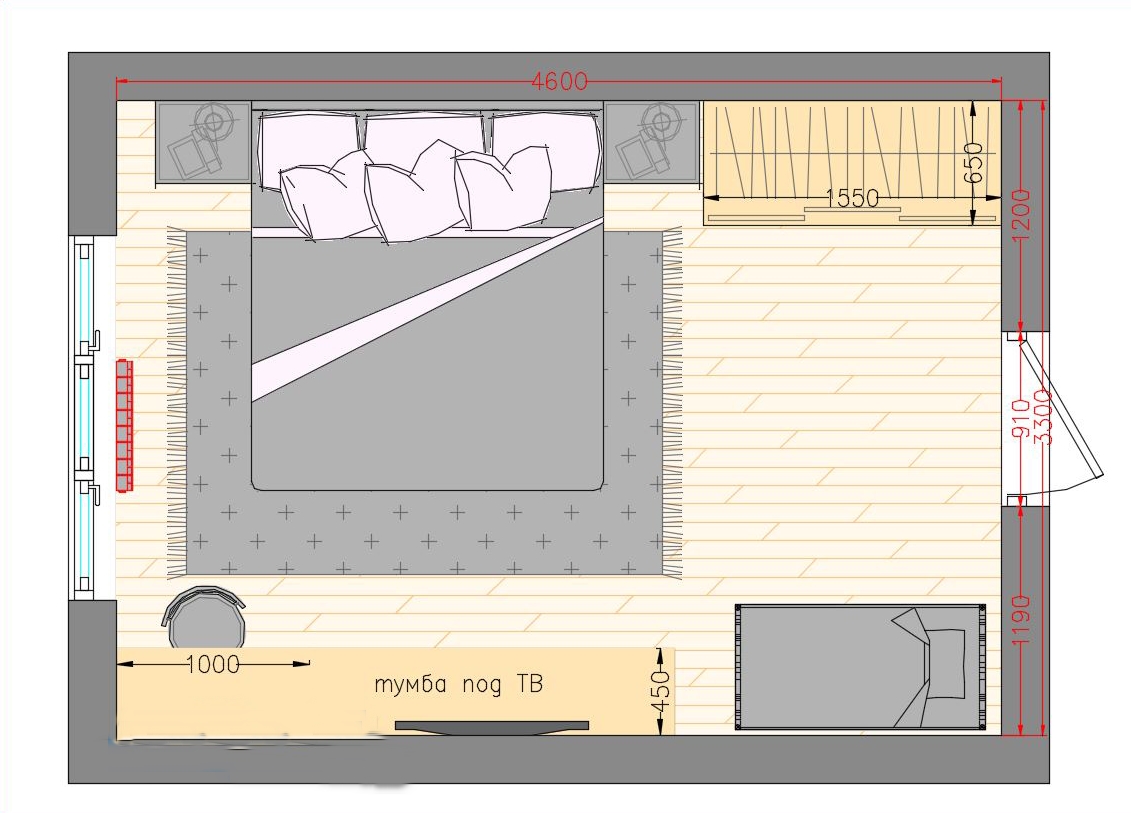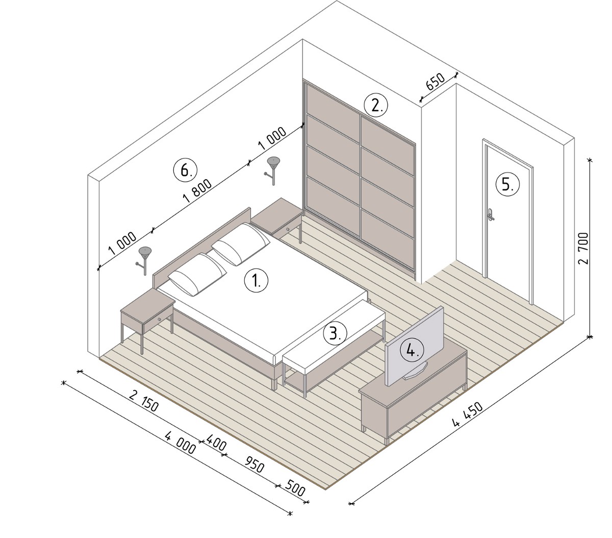 Dabei ist es gar nicht so wichtig, ob ein kompaktes Schlafzimmer oder eine große Fläche geplant ist. Es muss im Alltag so bequem und praktisch wie möglich sein. Dies bedeutet, dass bei der Bestimmung der erforderlichen Breite der Gänge das Ausrollen der Boxen und das Öffnen der Türen berücksichtigt werden müssen. Außerdem sollten sie keine anderen Möbel und Gegenstände im Raum berühren. Jedes Bett oder Sofa sollte 0,3 m länger sein als die größte Körpergröße normaler Benutzer.