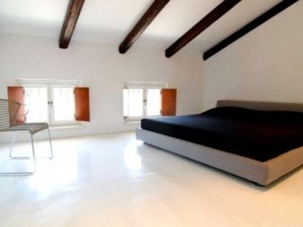 Eine andere Lösung für das Schlafzimmer kann „flüssiges Linoleum“ sein - ein selbstnivellierender Boden, der sich mit der Einzigartigkeit seines Designs rühmen kann. Diese Option kann allen Liebhabern von Originalität empfohlen werden, die über ein erhebliches Budget zur Umsetzung ihrer Ideen verfügen.