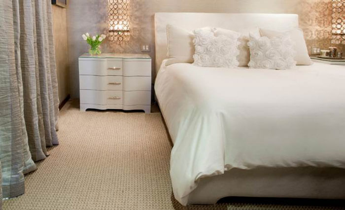 Dieses Material für den Schlafzimmerboden ist ein Teppich, der aus einer Basis und einem Flor besteht. Es kann allen Liebhabern von Wohnkomfort getrost empfohlen werden, denen vor allem ein angenehmes Tastgefühl wichtig ist. Weitere positive Eigenschaften von Teppichen sind:
