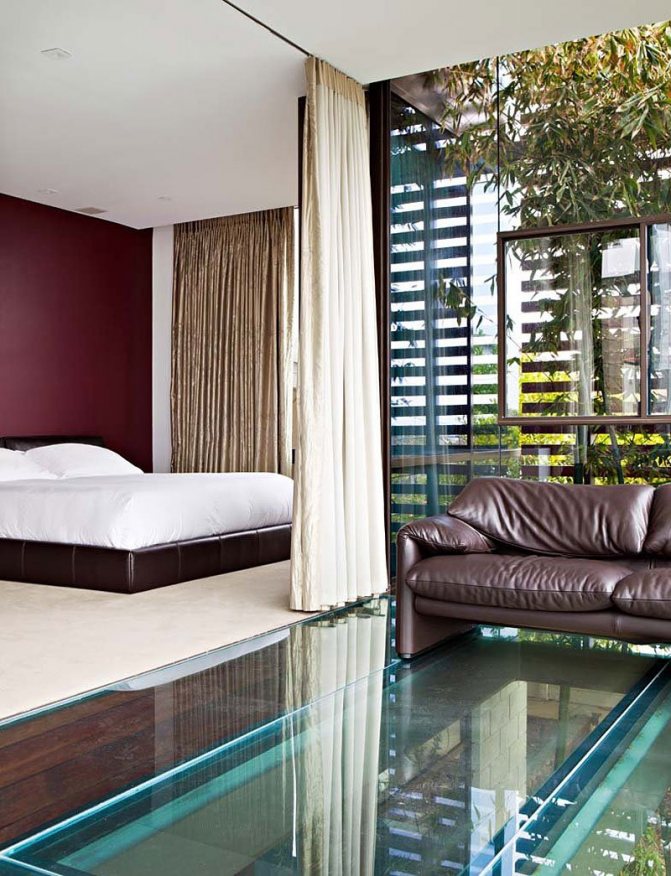- Glas... Eine der schicksten Optionen, die mit Streifen, Paneelen oder massiven Platten erhältlich sind. Für die Anordnung des Bodens wird am häufigsten Verbundglas verwendet, das starken mechanischen Belastungen standhält. Solche Beschichtungen sind schön, unverwechselbar, pflegeleicht und verschleißfest, und ihre Hauptnachteile sind Verschmutzung und hoher Preis.