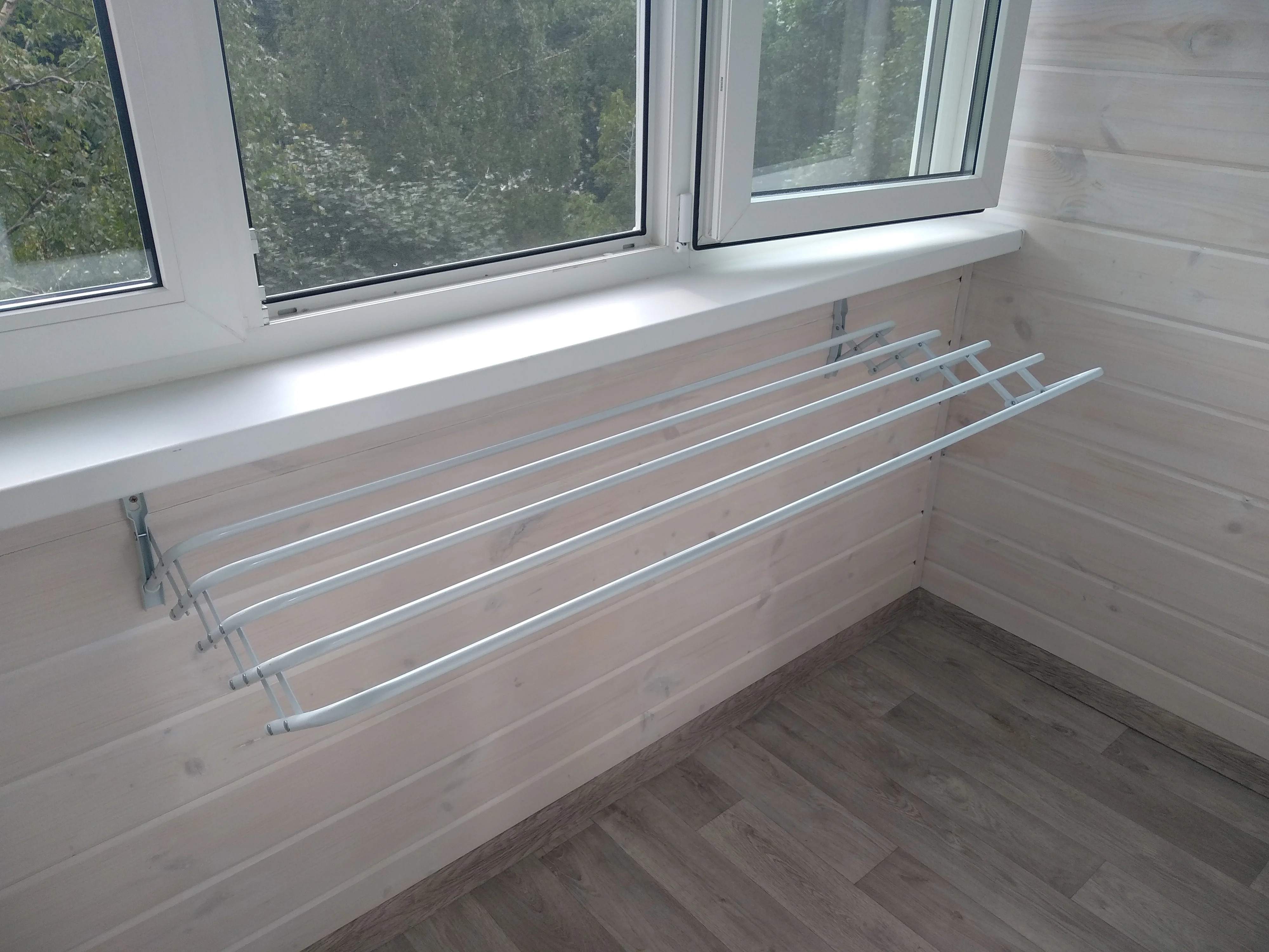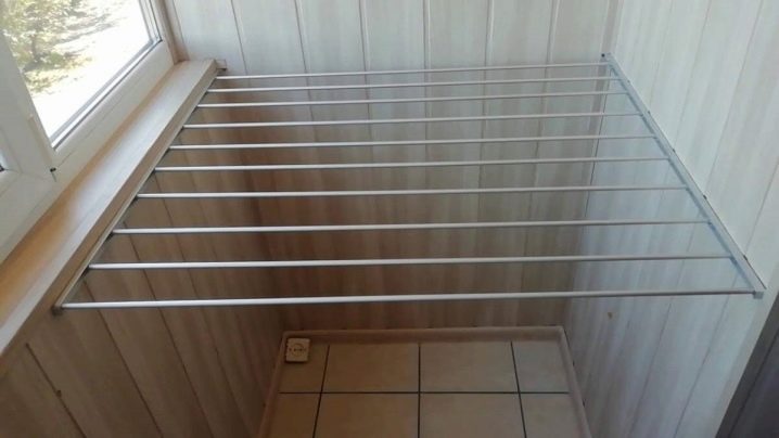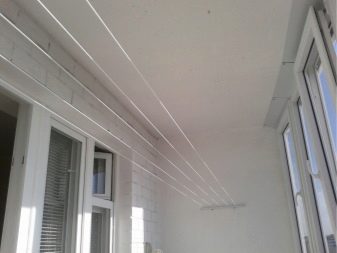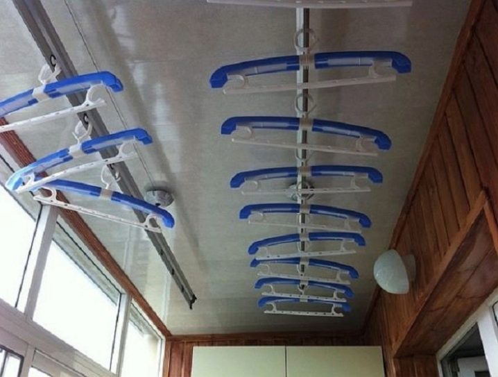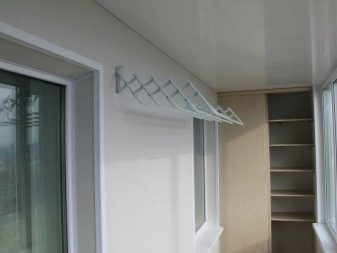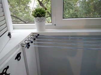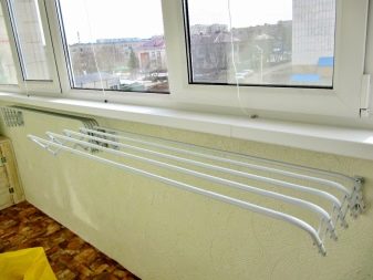 Es gibt eine große Auswahl solcher Produkte auf dem Markt. Kombiniert ihre Art der Befestigung an Halterungen oder T-förmigen Typ. Solche Trockner sind ideal für Loggien mit aufklappbaren Flügeln, da sie im Sommer das Öffnen von Fensterrahmen nicht beeinträchtigen. Sie ermöglichen eine rationelle Nutzung des verglasten Raums, der Aufbau und das Entfalten von Strukturen nimmt nicht viel Zeit in Anspruch. Ziehen Sie einfach leicht an der Außenkante der Trocknerstange, um sie aufzuklappen und zu sichern.