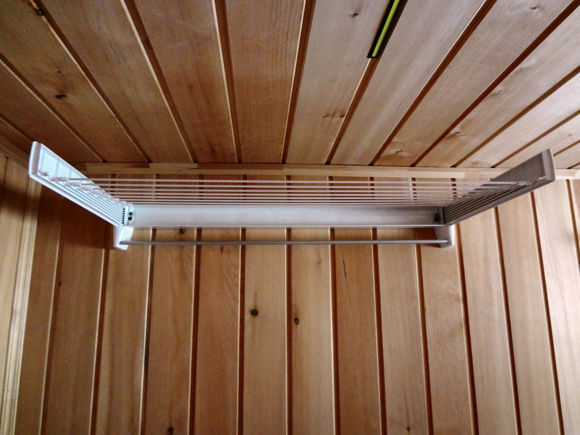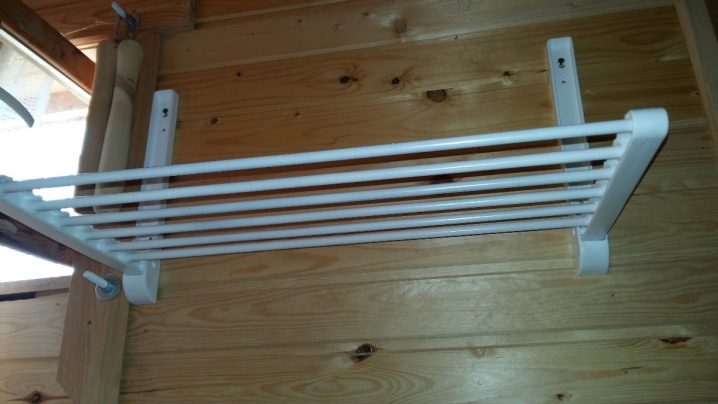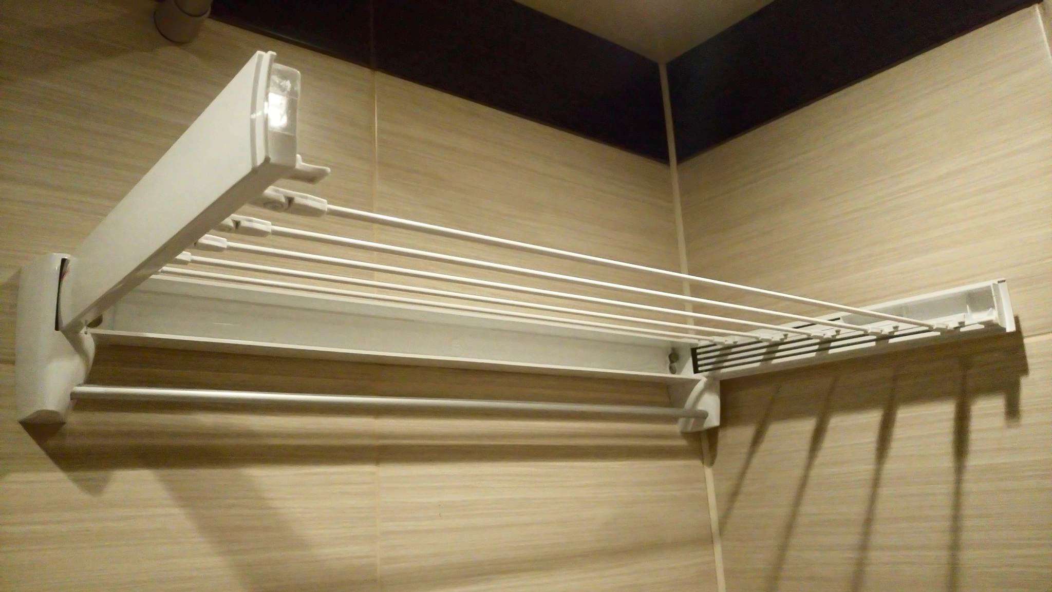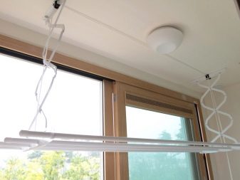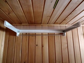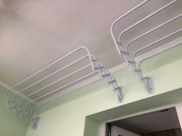 Neben wandmontierten stationären Aufbauten können Sie Deckentrockner verwenden, die zum Aufhängen der gewaschenen Wäsche einfach mit der Halterung abgesenkt werden.