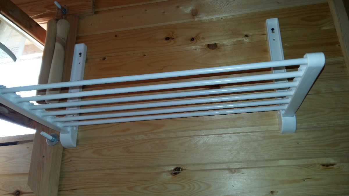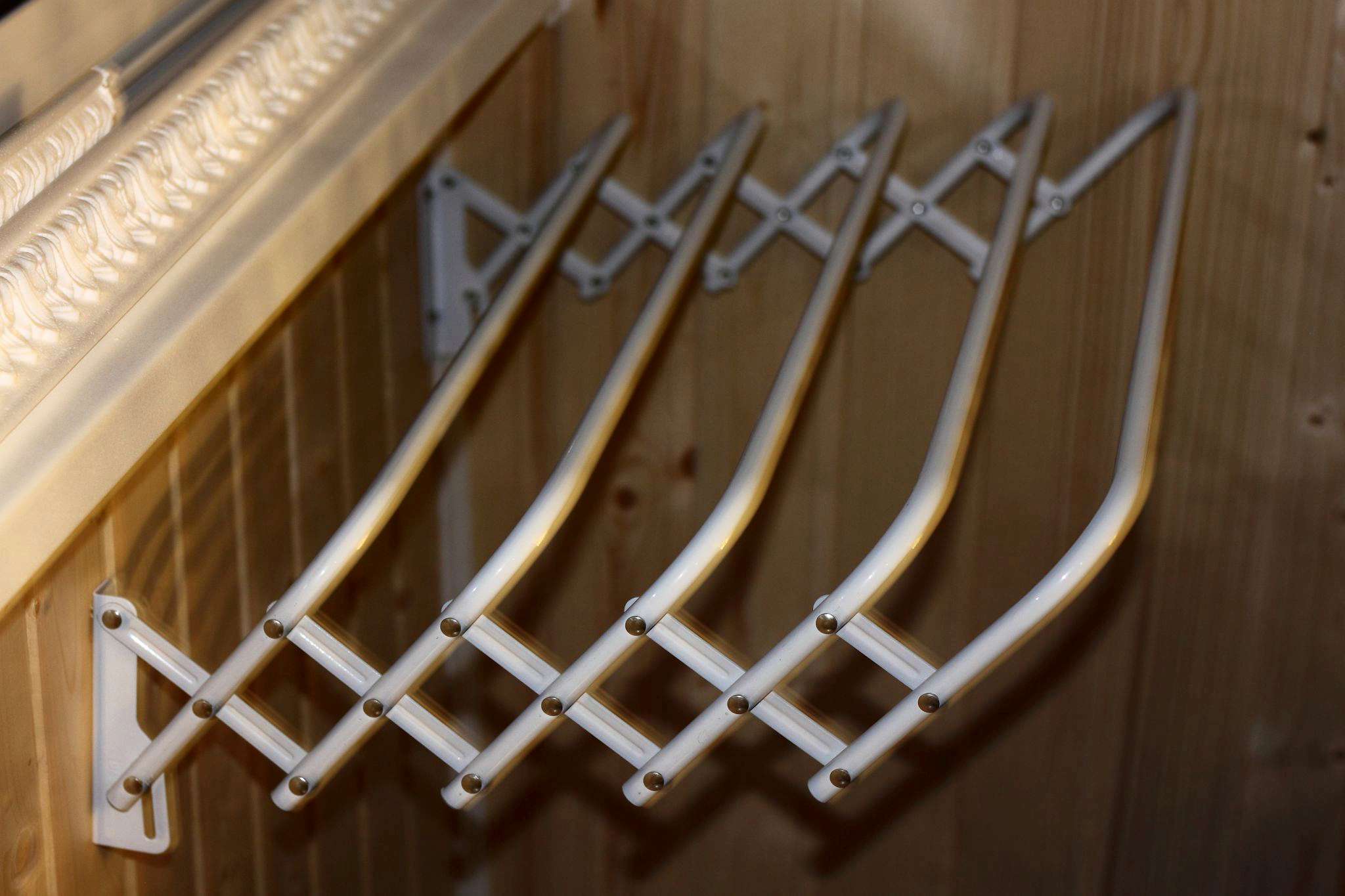 Komfortable Rahmen mit vielen Querstreben aus Leichtmetall, Holz oder strapazierfähigem Kunststoff, die senkrecht an der Wand montiert werden. Sie nehmen keinen Platz weg und halten einer Belastung von bis zu 3-5 kg stand. Die zerlegte Struktur ist stabil und hat eine gute Kapazität. Es hat in der Regel 3 bis 5 Querstangen, an denen Sie die gewaschene Wäsche reihenweise aufhängen können.