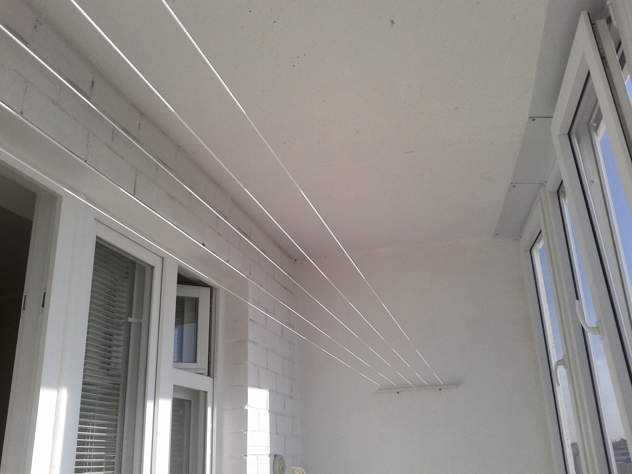 Die einfachste Art des stationären Wandtrockners sind an gegenüberliegenden Wänden eines Balkons oder einer Loggia angebrachte Haken, an denen Spannseile mit Ringen befestigt werden. Die Höhe der Haken und der Spannungsgrad der Seile werden bei der Installation angepasst. Nachdem die Wäsche getrocknet ist, werden die Seile von den Haken entfernt.