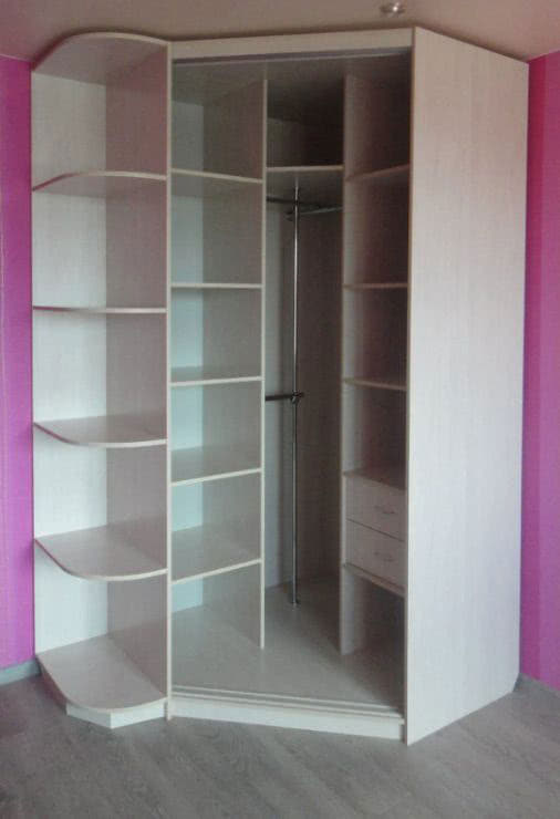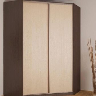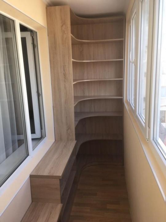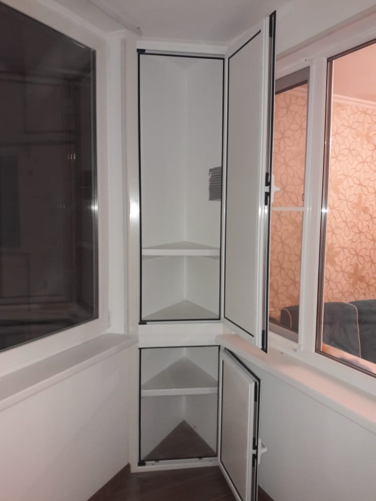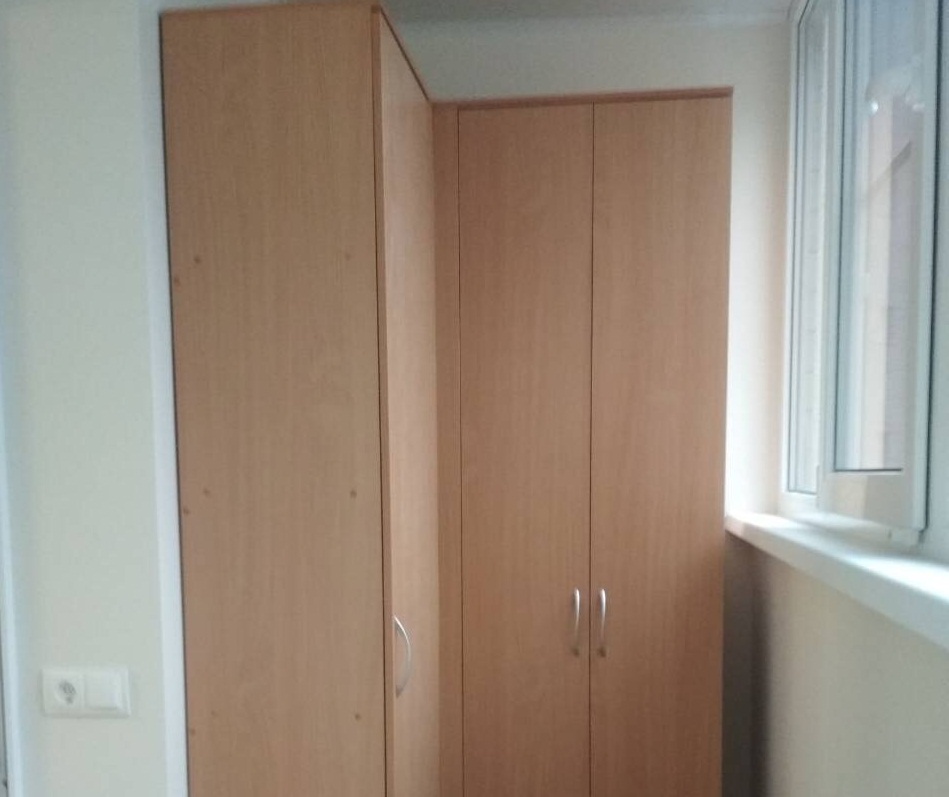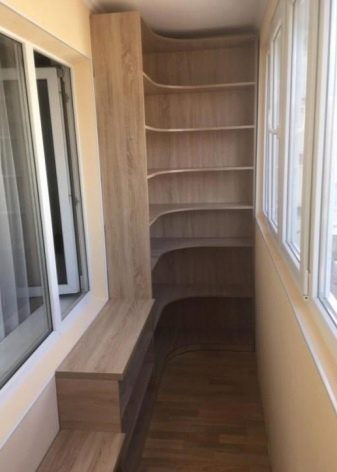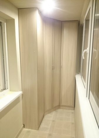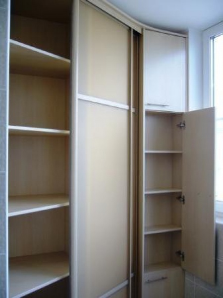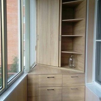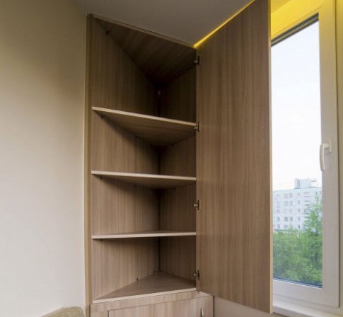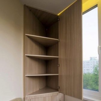 - Schräg... Dreieckige Modelle eignen sich für kleine Balkone. Sie glätten die scharfen Ecken der Loggia und machen den Raum komfortabler. Diese Schränke gelten als multifunktional. Sie haben viele Regale, Schubladen, Nischen und Abschnitte, auch ausziehbare. Es gibt oft eine Bar, an der Sie Ihre Kleidung aufhängen können. Solche Modelle harmonieren mit jedem Stil der Wohnung und helfen, den Raum in Zonen zu unterteilen.