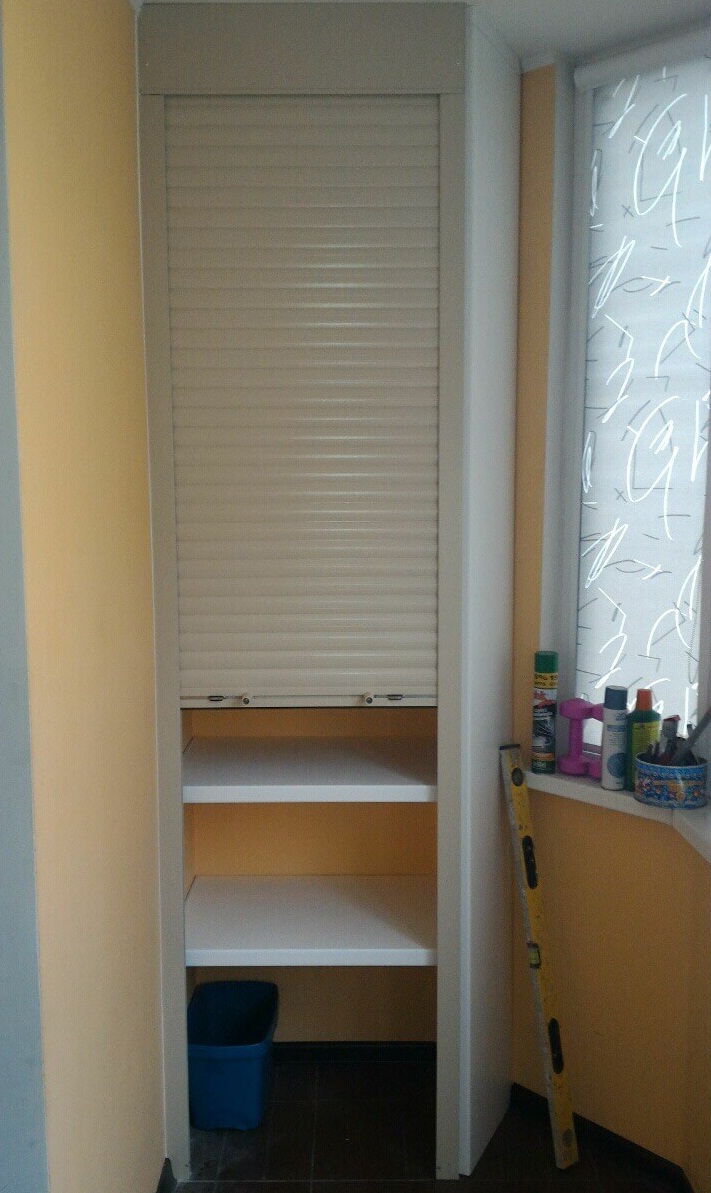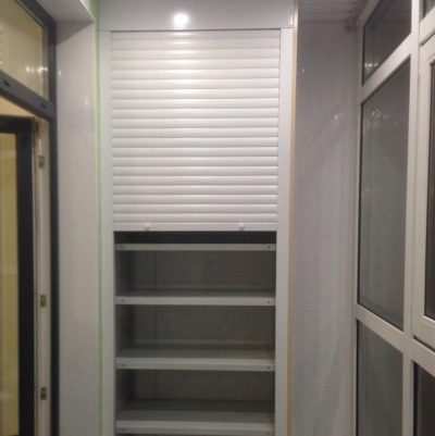 - Bei den Schließfächern mit Rollladen solche Nachteile gibt es nicht und sie eignen sich am besten für kleine Loggien. Obwohl nicht jedem das Design wie die Schaufensterfront gefallen wird. Und Staub und Feuchtigkeit können durch die Tür eindringen, weil sie nicht fest sitzt. Aber die Querstreifen an den Rollläden erweitern den Raum optisch und machen ihn geräumiger. Eine solche Struktur wird 10 Jahre oder länger dauern.
