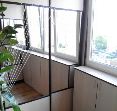 Der Platz auf dem Balkon ist sehr begrenzt, was uns zwingt, nach nicht standardmäßigen Designlösungen zu suchen. Daher sind Schließfächer auch in der Form völlig ungewöhnlich.