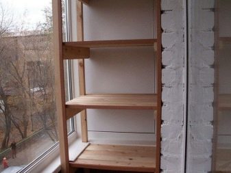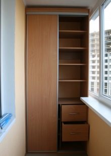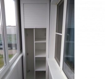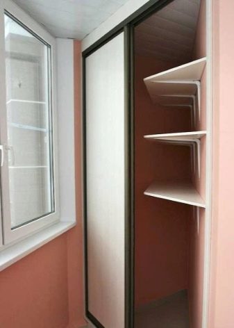 Die meisten Einbauschränke sind 45-56 cm tief und nicht breiter als 1 m. Um das Produkt so elegant und luftig wie möglich zu gestalten, sollten Modelle bevorzugt werden, bei denen die Ablagen an den Seiten in einem gemusterten Design ausgeführt sind.Sie können Bücher oder Dekorationsgegenstände darauf platzieren. Wenn die Loggia geräumig ist, setzen die Eigentümer der Räumlichkeiten oft ein dreieckiges Modul ein - diese Option ist optimal für Balkone in Luxushäusern und Loggien in privaten Cottages.