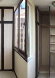 Wenn die Ecke, in der das Balkonfenster die Balkonwand berührt, nicht belegt ist, ist es besser, den Schrank neben das Fenster zu stellen. Normalerweise wird dieser Schrank durch einen kleinen Tisch unter der Fensterbank ergänzt, er wird sozusagen zu einer Erweiterung des Schranks.