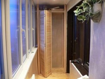 - Harmonisch - Dieser Mechanismus basiert auf der Verwendung mehrerer Blätter, die sich beim Öffnen nach Art einer Ziehharmonika ineinander falten. Das unbestrittene Plus einer solchen Tür ist die Möglichkeit, Platz auf dem Balkon zu sparen. Beim Ausfahren geht die Tür nicht nach innen, sondern öffnet sich nach außen, damit der Innenraum des Aufbewahrungssystems nicht verloren geht. Ein solcher Schrank hat alle Chancen, ein echtes Highlight im Innenraum zu werden, insbesondere wenn Sie eine Tür aus perforiertem Glas für Möbel herstellen - dies verleiht dem Stil der Loggia zweifellos Originalität und Kreativität.