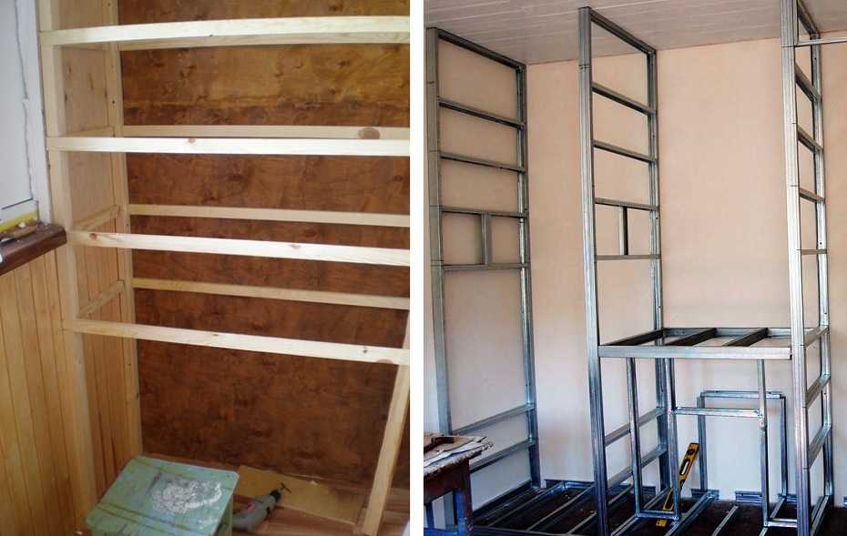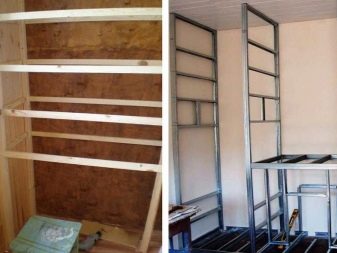 Regale werden normalerweise aus Plattenmaterial geschnitten - dies kann dickes Sperrholz, Standard- oder laminierte Spanplatten sein. Sie werden mit selbstschneidenden Schrauben oder an speziell installierten Stangen befestigt. Alternativ können Sie die Regale auch mit Ecken direkt an der Schrankwand befestigen.