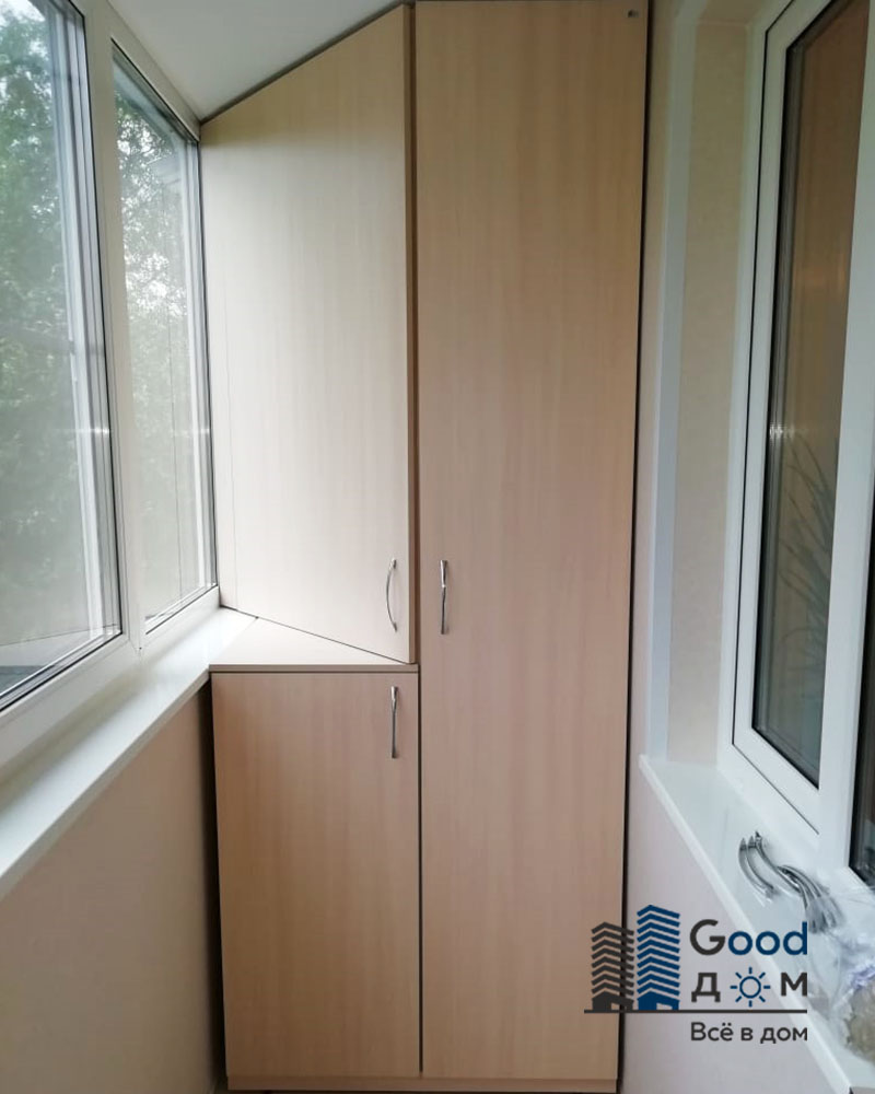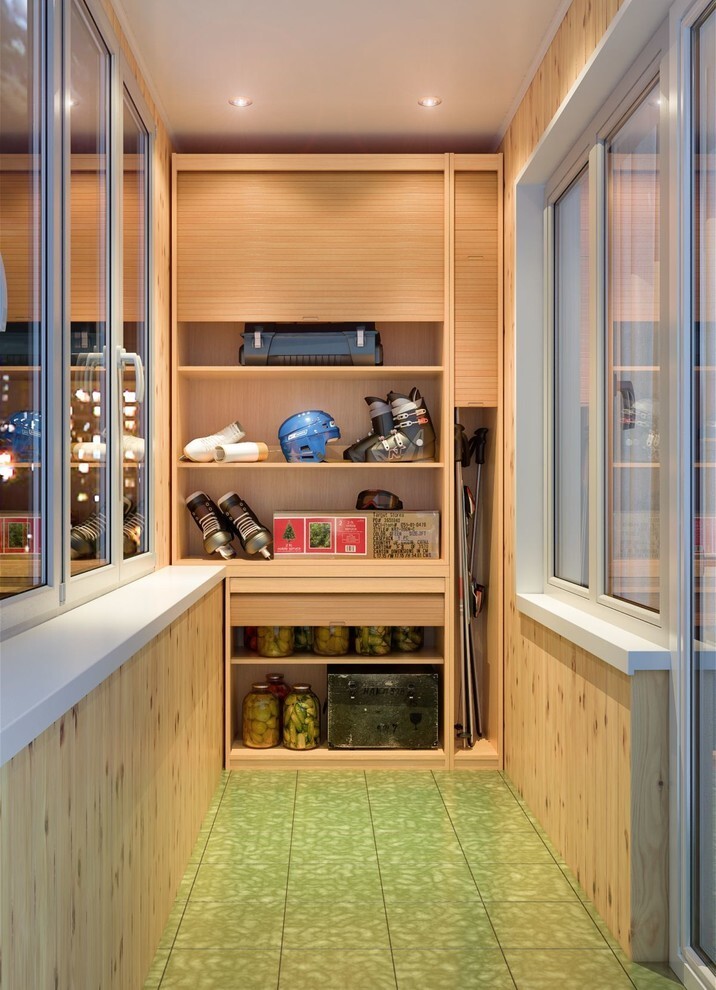 Für eine Loggia von 6 qm Eine praktische Lösung wäre, einen Einbauschrank in die Ecke zu stellen.