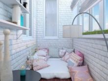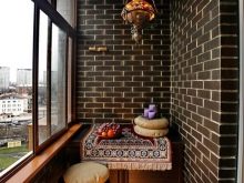 - Wenn Sie planen, viele Möbel auf dem Balkon oder der Loggia aufzustellen, platzieren Sie ein helles, farbenfrohes, gemustertes Dekor, Ziegel können eine verbotene Option sein. Besonders hell oder eine, die sich von der Farbe der Nähte abhebt. Wie die Designer sagen - auch passend.