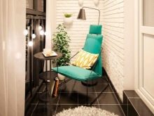 - Aber ein schicker, tiefgrauer Backstein auf einer unregelmäßig geformten Loggia schafft eine Atmosphäre der Entspannung und Ruhe. Sie können die Farbe der Möbel durch weiße Farbtöne ersetzen, aber dann sieht der Raum etwas verschlafen und kühl aus.