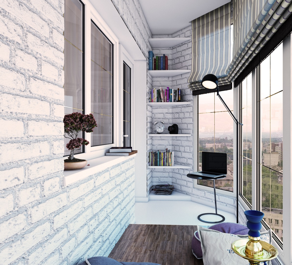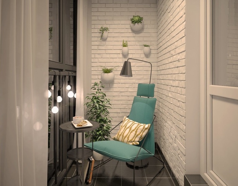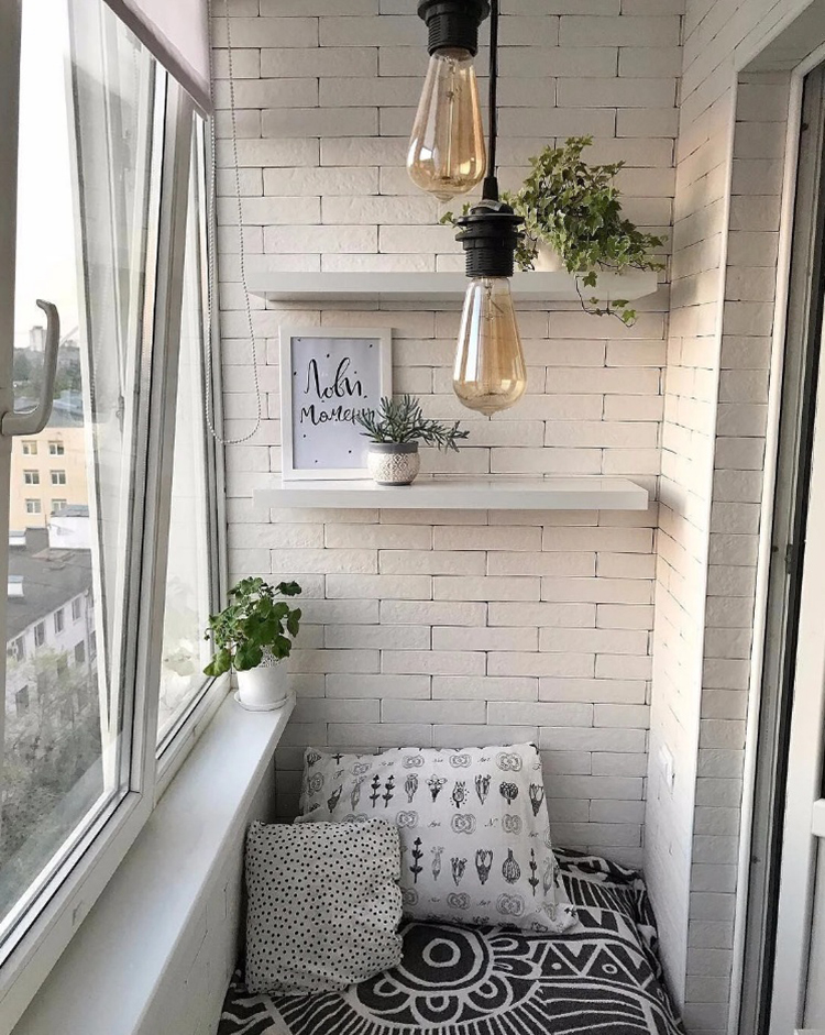 - Weißer Backstein auf einem sehr schmalen Balkon - eine niedliche Lösung lenkt vom kleinen Filmmaterial ab. Keine unnötigen Farben, natürliche und ansprechende Kombinationen beweisen einmal mehr, dass nicht das Budget entscheidet, sondern der Geschmack und die Lust.