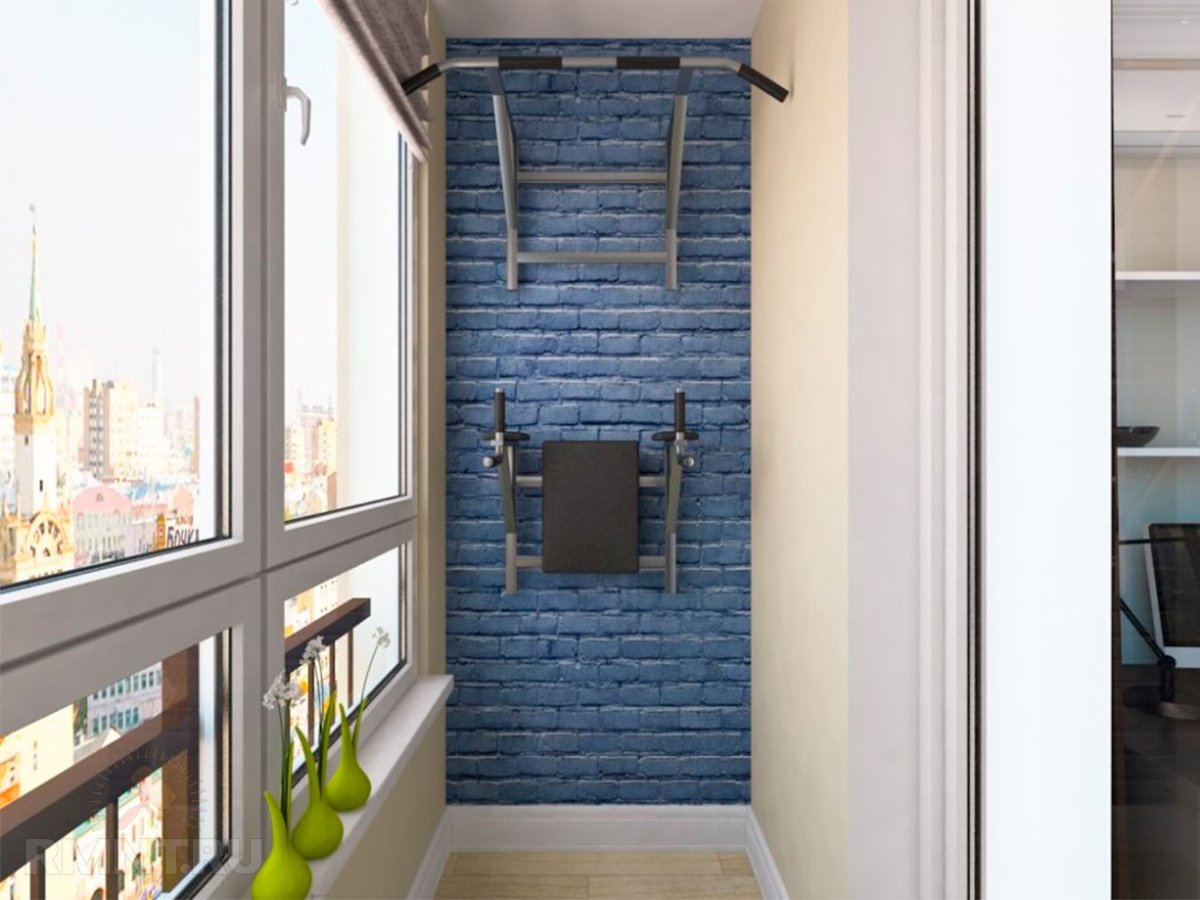 - An einer schmalen Wand gibt es Mauerwerk und sogar in einer ungewöhnlichen Farbe gestrichen - blau. Das Fitnessstudio auf der Loggia befindet sich häufig, und solche Farbakzente sowie das Hervorheben des Hintergrunds aufgrund der Textur sind ein Gewinn.