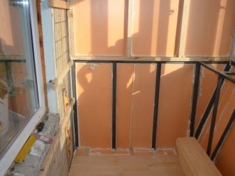 Alle Trockenbauwände müssen an dem dafür vorgesehenen Metallprofil befestigt werden. Und Sie können auch Holzklötze verwenden, aber ein Profil für solche Zwecke ist besser geeignet. Der nächste Schritt besteht darin, einen Rahmen aus einem Metallprofil zu bauen. Dazu werden zunächst zwei Guides installiert. Einer auf dem Boden, der andere an der Decke. In diese Führungen werden Zwischenprofile eingelegt, die 40 cm breit voneinander befestigt sind. Das Profil wird mit Aufhängern an der Wand befestigt. Die Montage der Struktur erfolgt mit selbstschneidenden Schrauben für Metall. Ein solcher Rahmen kann sowohl an der Wand als auch an der Decke einer Loggia oder eines Balkons verwendet werden.