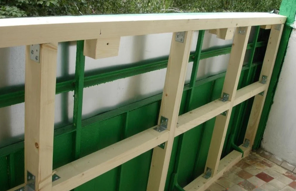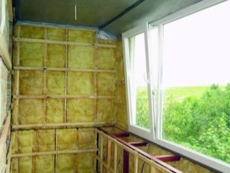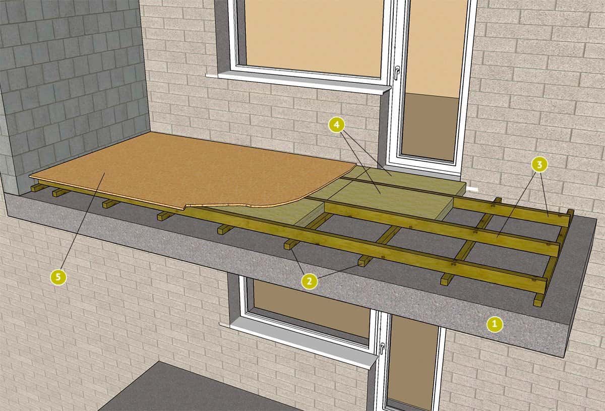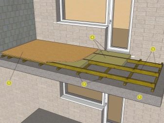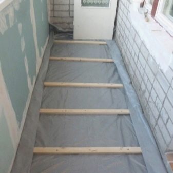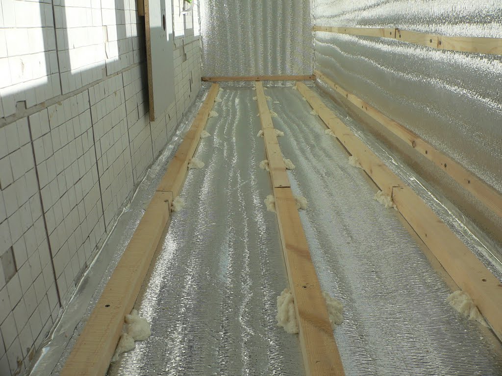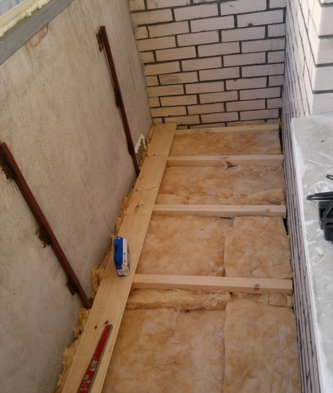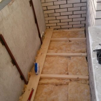 Zu Beginn der Arbeiten wird der gesamte Betonsockel grundiert und die Markierungen für die Verlegestellen der Stäbe vorgenommen. Alle Holzteile müssen mit einer Feuerlöschmasse behandelt werden. Der Befestigungsabstand zwischen den Balken beträgt nicht mehr als 50 cm Sie werden mit Dübeln entlang des gesamten Bodens parallel zueinander befestigt. Und auch mit Balken können Sie den gesamten Boden nivellieren, wenn der Boden des Balkons uneben ist. Nach der Montage der Lattung zwischen den Balken wird die Dämmung so verlegt, dass sie bündig mit den Balken ist. Die Dicke des Dämmstoffes muss für jede Etage individuell berechnet werden.