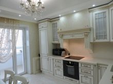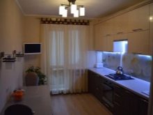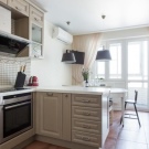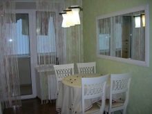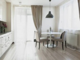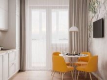 Bedenken Sie, dass der Lichtfluss in einer Küche mit Loggia geringer ist als in Räumen, in denen das Fenster direkt auf die Straße blickt. Dies bedeutet, dass abgedunkelte Vorhänge keine gute Lösung sind - sie verdunkeln die Küche noch mehr. Es empfiehlt sich, Nude-Töne mit transparenten sowie transluzenten Texturen zu bevorzugen.