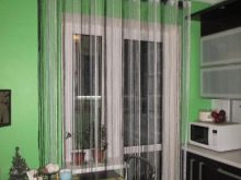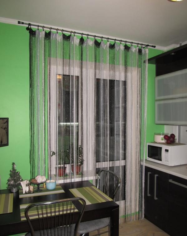 Filamentvorhänge sind besser bekannt als Musselin oder Nudeln. Sie sind relevant für die Dekoration kleiner Fenster in kleinen Küchen... Solche Vorhänge werden in Form von länglichen dünnen Fäden hergestellt - sie sehen elegant und ungewöhnlich aus. Kiseya aus Fäden verleiht der Küche optisch Volumen und hebt die Decke an, wodurch das allgemeine Gefühl von Wärme und Licht entsteht. Das Plus ist die Wartungsfreundlichkeit.
