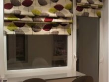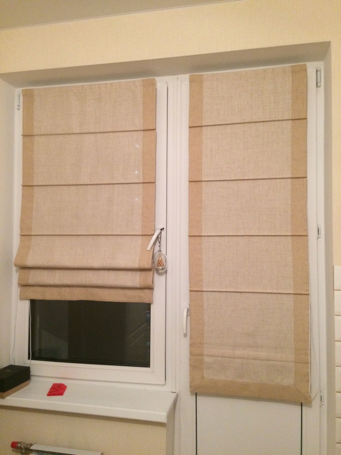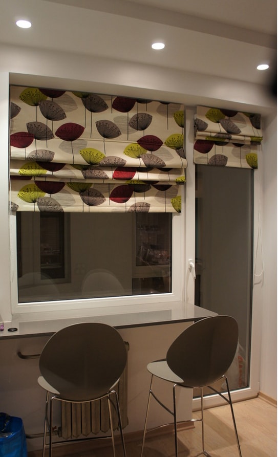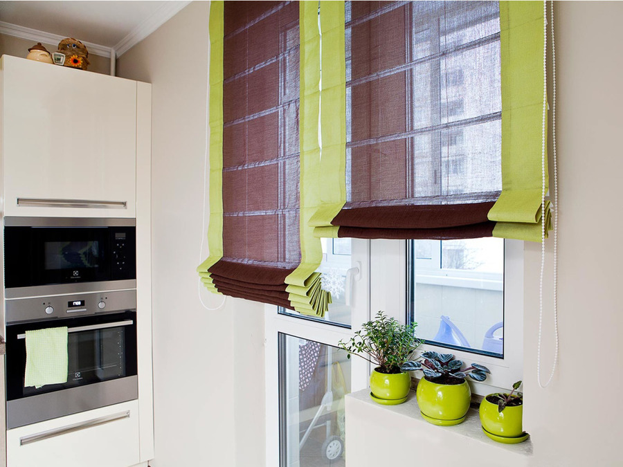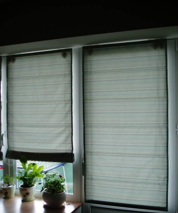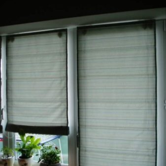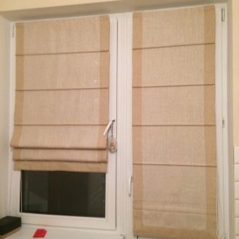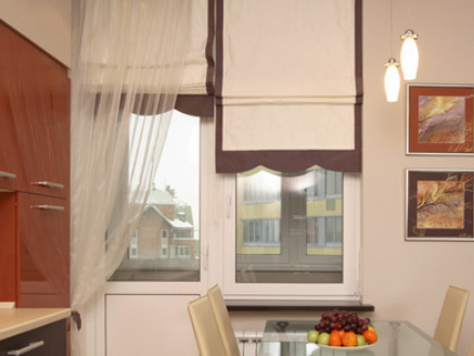 Zum Nähen römischer Vorhänge werden natürliche und künstliche Leinwände verwendet. Künstliche Textilien sind optimal für Küchenzeilen mit Zugang zum Balkon. Solche Vorhänge werden normalerweise in Abschnitten befestigt - der erste über dem Fenster, der zweite über der Tür.