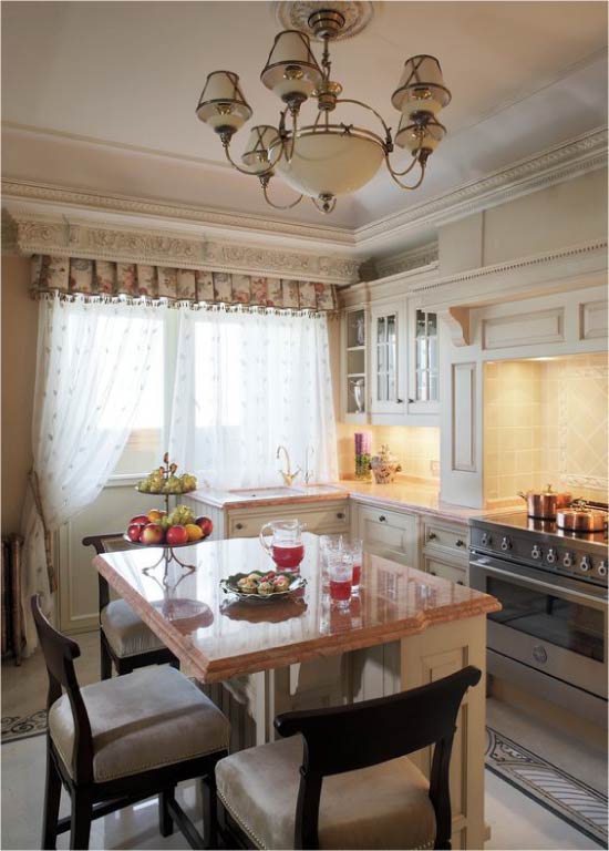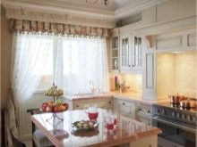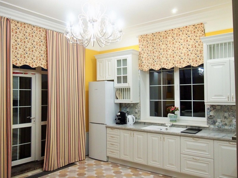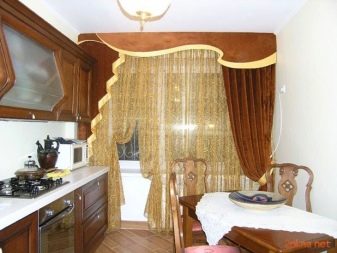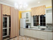 Vorhänge mit Lambrequins können selbst das einfachste Interieur in wenigen Minuten verändern. Besonders stilvoll wirken sie in Kombination mit gewichteten Vorhängen. Wenn die Küche jedoch klein ist, ist es besser, dezente Lambrequins zu verwenden. Außerdem ist eine solche Lösung absolut nicht für High-Tech-, moderne und minimalistische Räume geeignet. Aber im klassischen Design werden sie sehr passend sein.