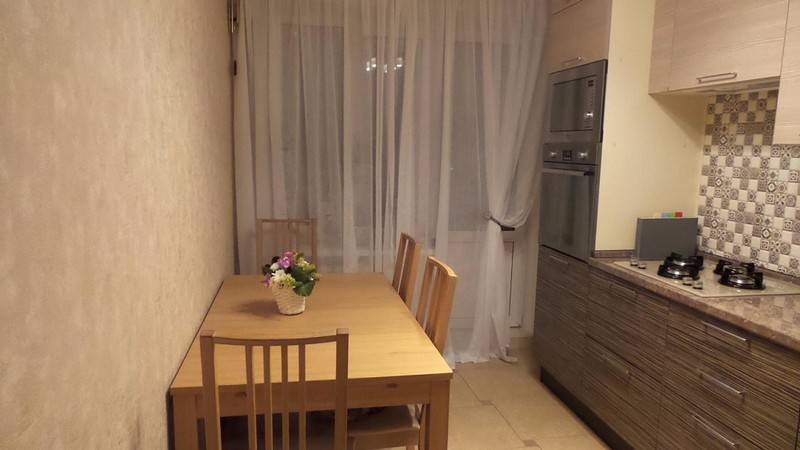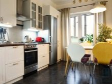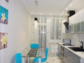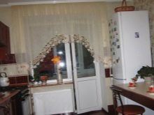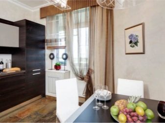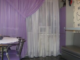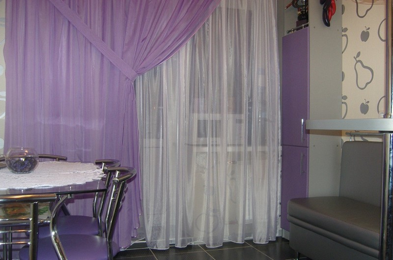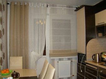 Wenn sich die Küche auf der Südseite befindet, ist es besser, dichte Stoffe zu wählen. Sie bieten einen wirksamen Schutz vor direkter Sonneneinstrahlung. In allen anderen Situationen, in der Küche mit Tür zur Loggia, fehlt es an natürlicher Sonneneinstrahlung, da dort dünne Stoffe mit Verunreinigungen aus Baumwolle oder Viskose benötigt werden - sie bilden keine Hindernisse im Lichtweg.
