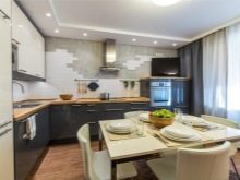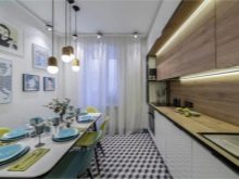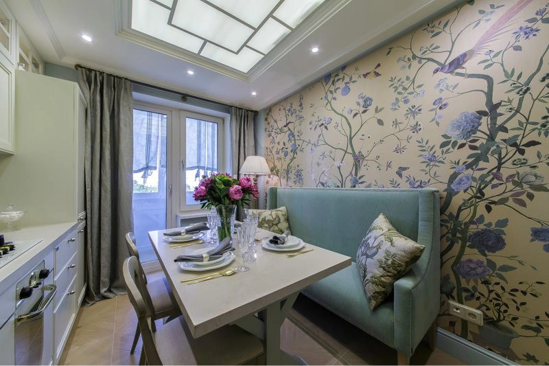 In den letzten Jahren ist es bei der Installation von abgehängten Decken in Mode gekommen, die Leinwand nicht an die Wand zu bringen, sondern eine kleine Nische zu hinterlassen. In Zukunft wird darin ein Gesims befestigt, das für das äußere Auge unsichtbar ist. So entsteht im ausgehängten Zustand das Gefühl eines Webstreams von oben. Wenn eine solche Decke vom Küchenlayout nicht vorgesehen ist, kann die Befestigung der Vorhänge mit einem Baguette mit Gesims verziert werden. Gardinen mit Ösen wirken auf einem abgerundeten Wandgesims organisch - sie werden sofort auf die Gesimse aufgesetzt. Aber Vorhänge auf einem Vorhangband sehen auf kompaktem Raum am harmonischsten aus.