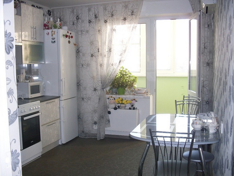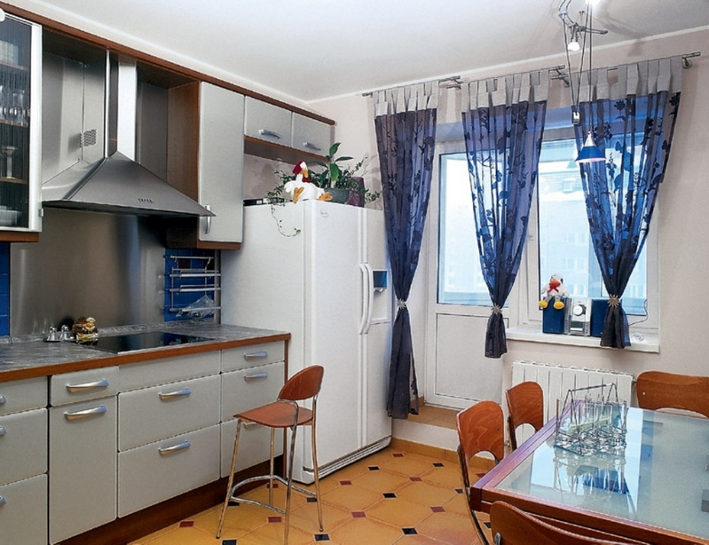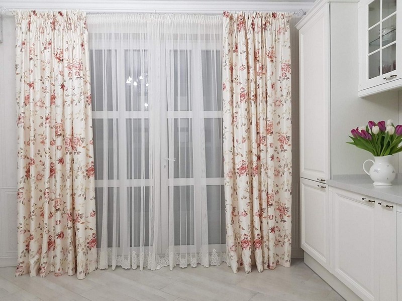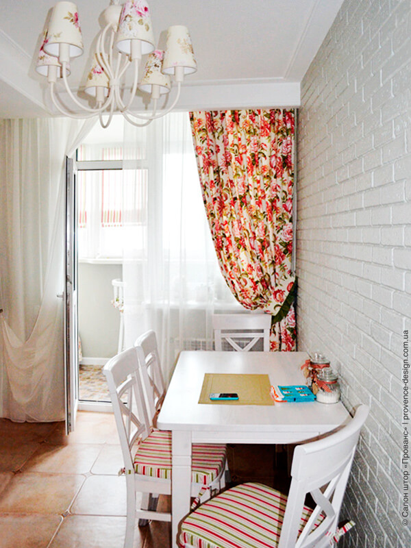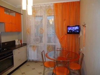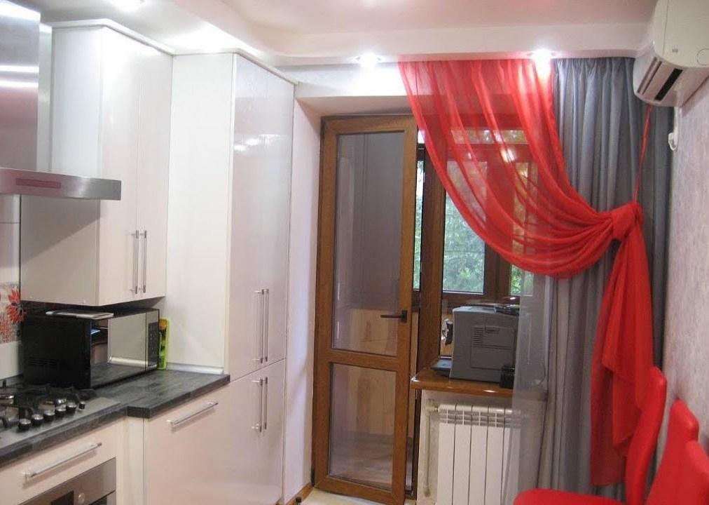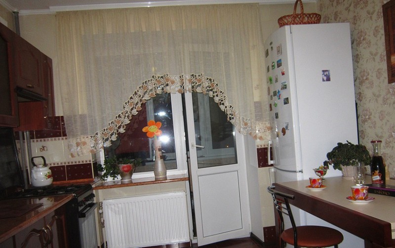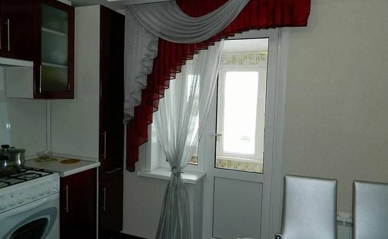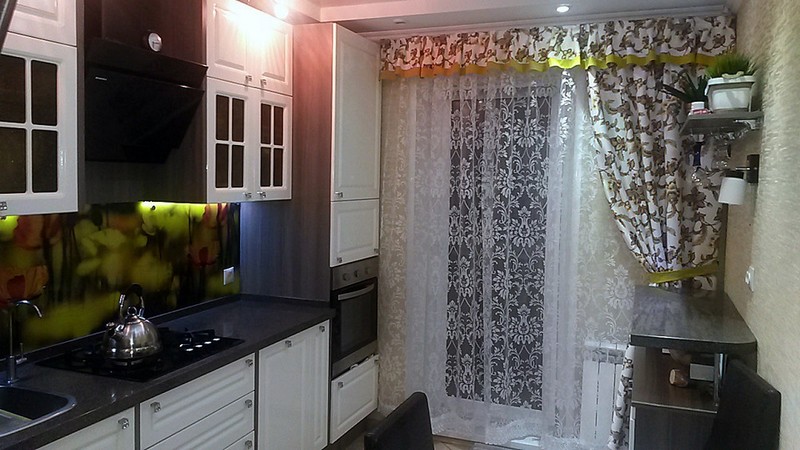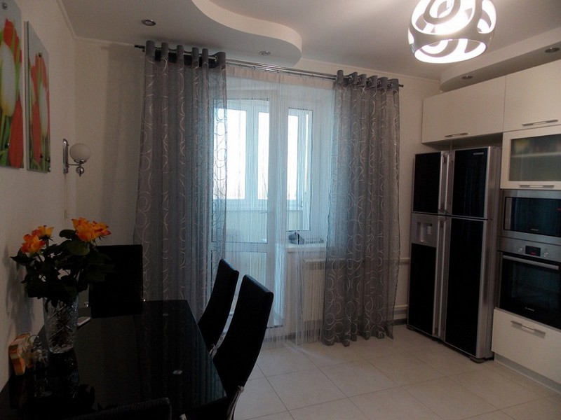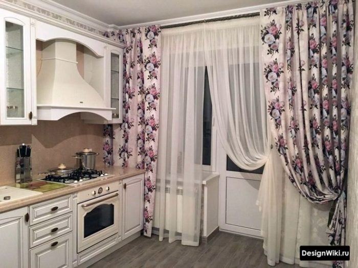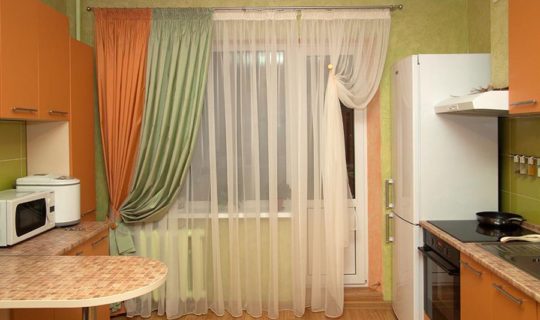 Vorhänge werten das Kücheninterieur auf. In Räumen mit Balkon erfüllen sie eine Reihe wichtiger Aufgaben: