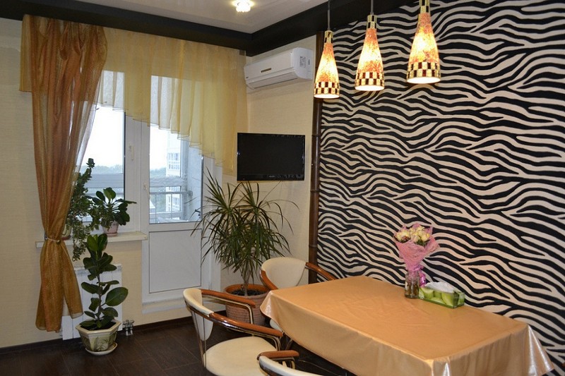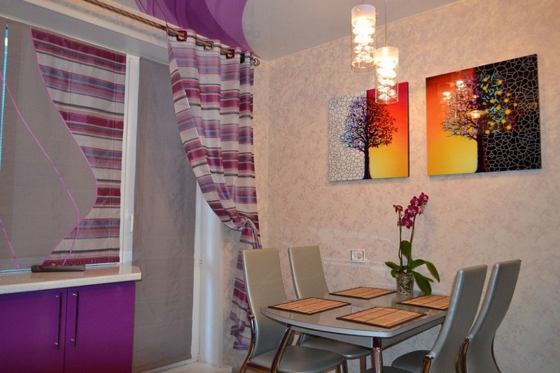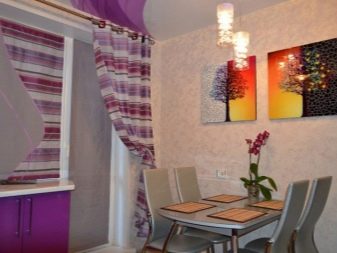 In den letzten Jahren haben Interieurtrends Asymmetrie befürwortet, und ein Fenster mit einer Loggia bettelt buchstäblich nach einem ähnlichen Design. Schräge Vorhänge in Kombination mit traditionellen rechteckigen Modellen sind eine sehr gute Idee. Wenn Sie das Küchenfenster mit Zugang zur Loggia dekorieren, können Sie auch asymmetrisch angeordnete Leinwände in verschiedenen Farben verwenden.