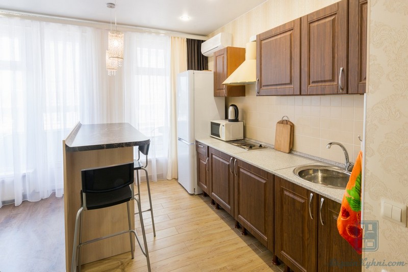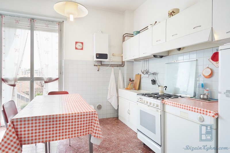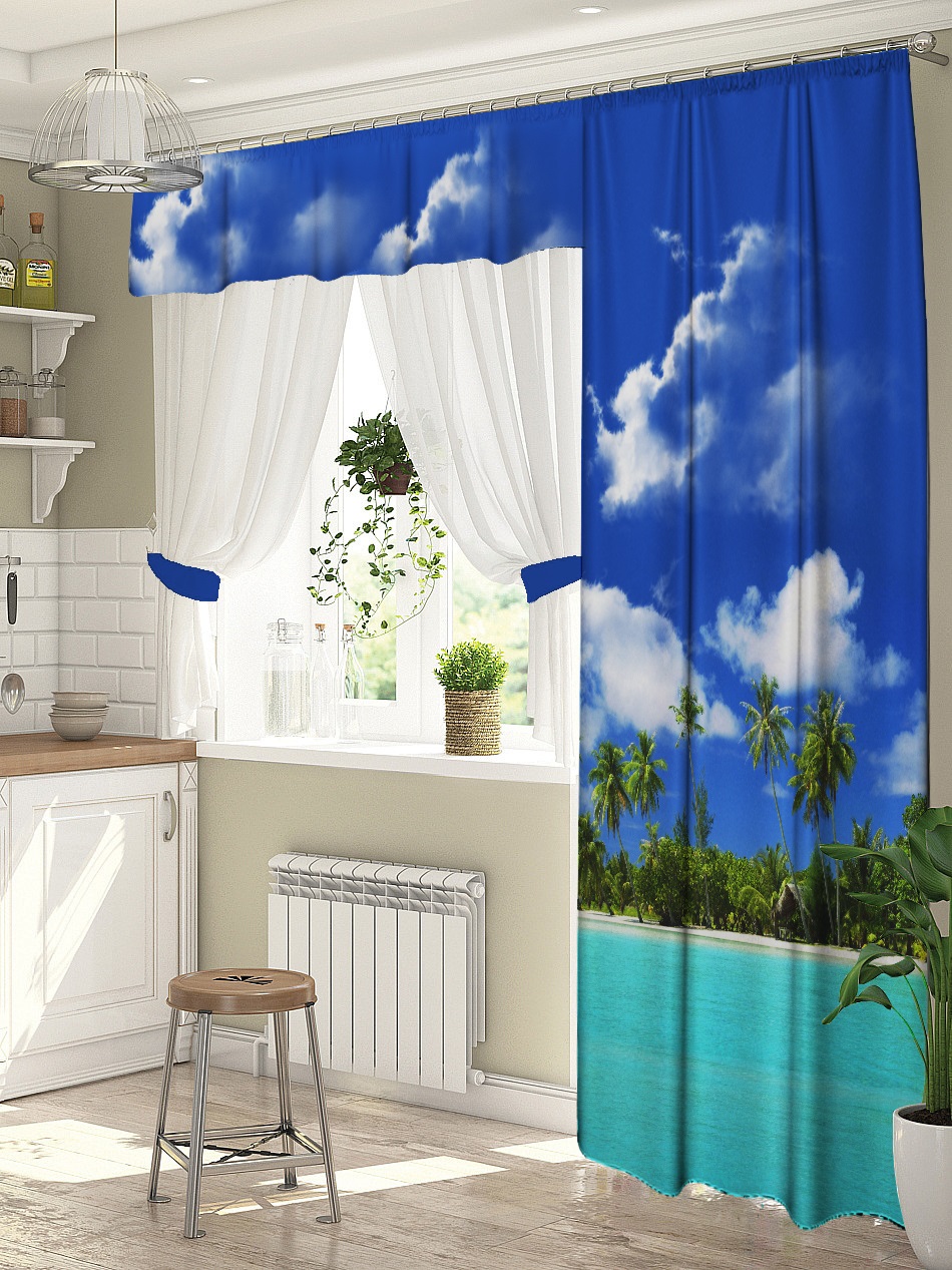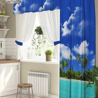 Wenn in der Küche kein Platz für eine Akzentwand ist, kann ein 3D-gedrucktes Fotonetz seine Rolle spielen. Perspektivische Bilder erweitern optisch den Balkonraum und vergrößern dadurch den kompakten Küchenraum. Solche Vorhänge sehen sehr stylisch aus - das ist nicht verwunderlich, da absolut jedes Muster auf die Leinwand gedruckt werden kann.