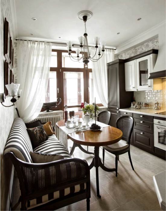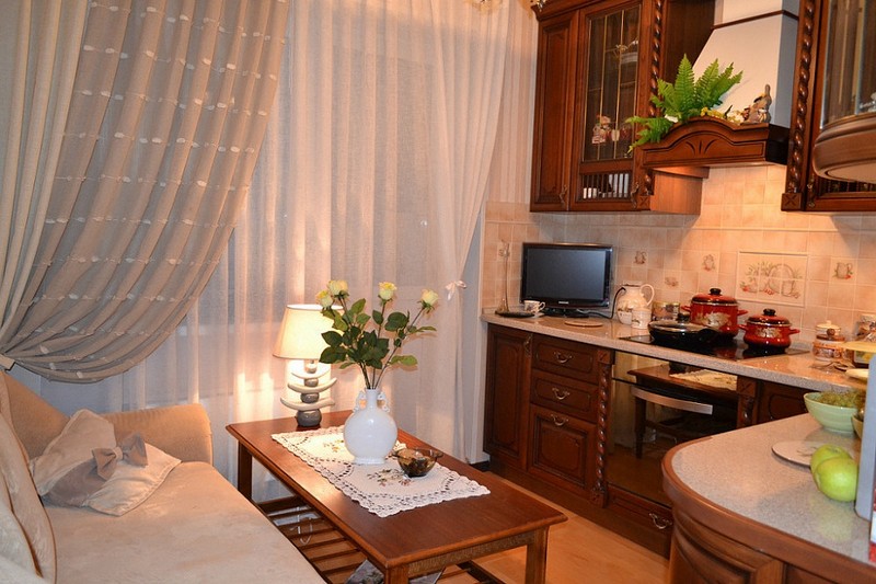 Für klassische Gardinen können verschiedene Stoffarten verwendet werden. Es ist besser, sich für ein Material zu entscheiden, das den im Küchenbereich unvermeidlichen widrigen Einflüssen standhält. Solche Vorhänge fügen sich harmonisch in das traditionelle Design ein, sie kommen nie aus dem Trend und sehen in jeder Situation angemessen aus. Der Vorteil solcher Modelle besteht darin, dass Sie den Heizkörper unter der Fensterbank vollständig verkleiden können.