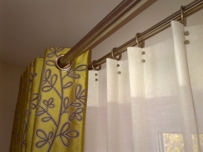 In den letzten Jahren haben sich Ösentextilien verbreitet. In diesem Fall werden lange Vorhänge mit am oberen Teil der Leinwand angenähten Ösen am Gesims befestigt. Dies ist eine gute Idee für Räume mit einer Tür zu einer Loggia, da die Vorhänge das reibungslose Öffnen der Türen nicht beeinträchtigen und keine speziellen Vorrichtungen für die Installation erfordern.
