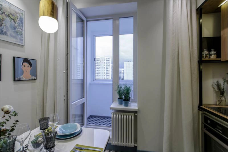 Vorhänge, deren Design den Ausgang zur Loggia nicht behindert, sind eine gute Lösung. Zu dichte Vorhänge, die den Ausgang von der Decke zum Boden verschließen, funktionieren dafür nicht. Wenn sie oft beiseite geschoben werden, verlieren sie nach ein paar Monaten ihr ästhetisches Aussehen.