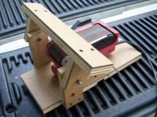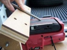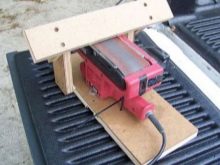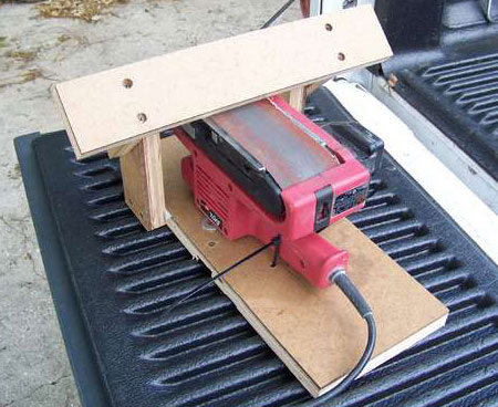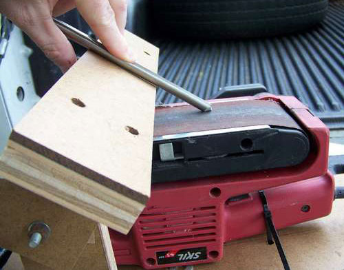 Bandschleifer zeichnen sich durch eine breite und gleichzeitig recht ebene Arbeitsfläche aus. Um die beschriebenen Klingen zu schärfen, muss das Gerät mit dieser Hobel nach oben positioniert werden.
