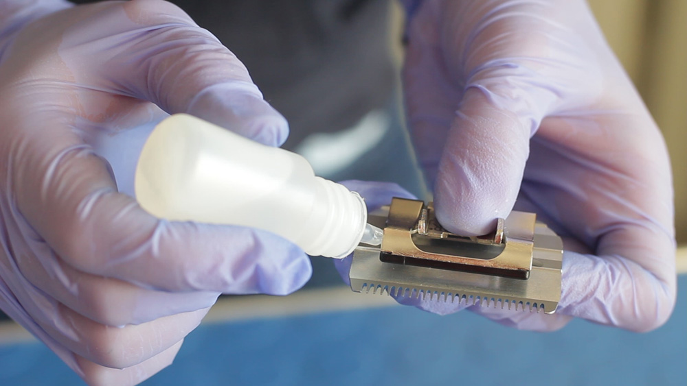 - Auftragen einiger Tropfen Öl auf die Schneidkante der Messer, parallel wird das Schmiermittel auf beide Seiten des Messerblocks selbst aufgetragen;
