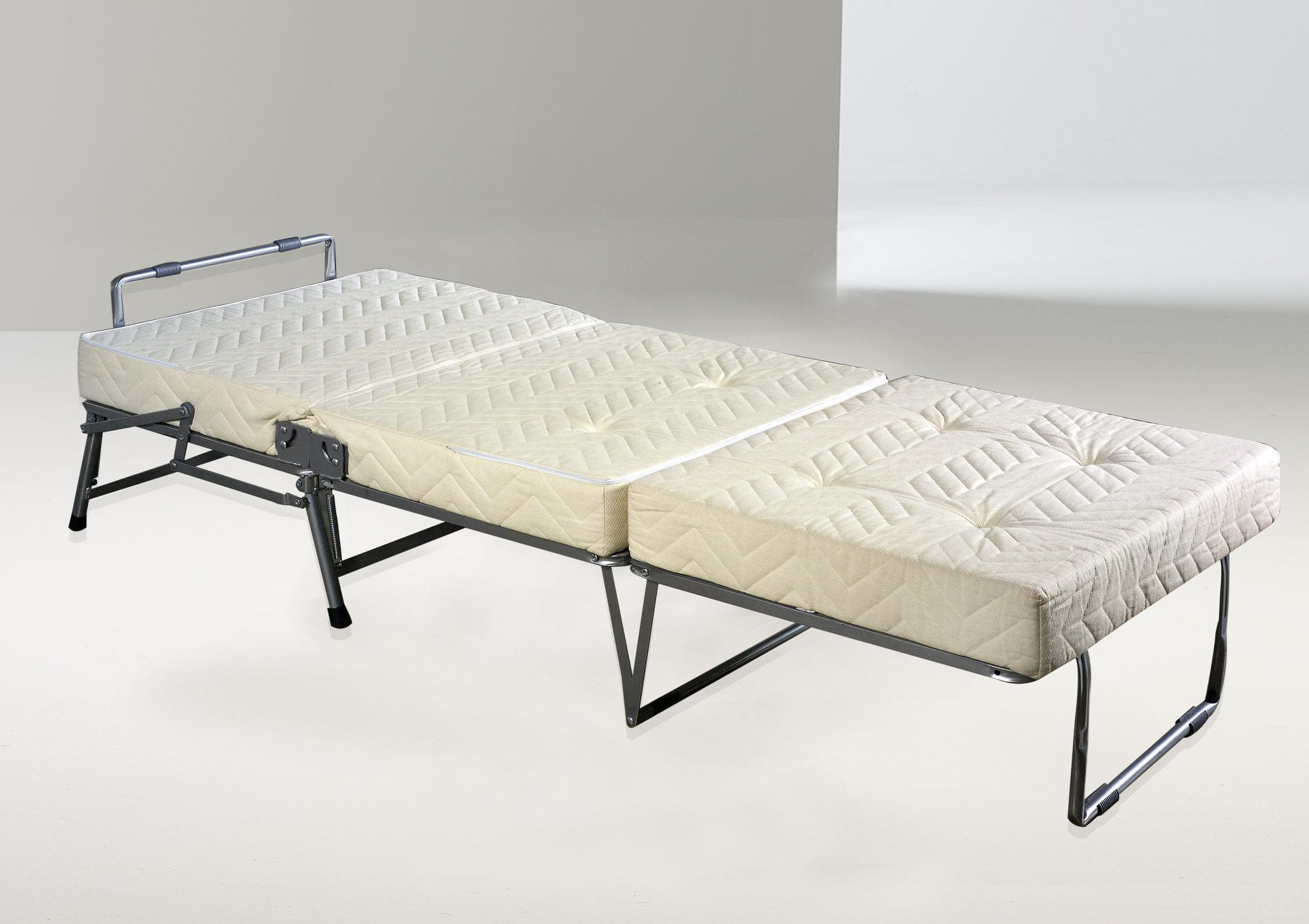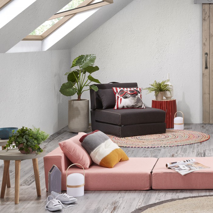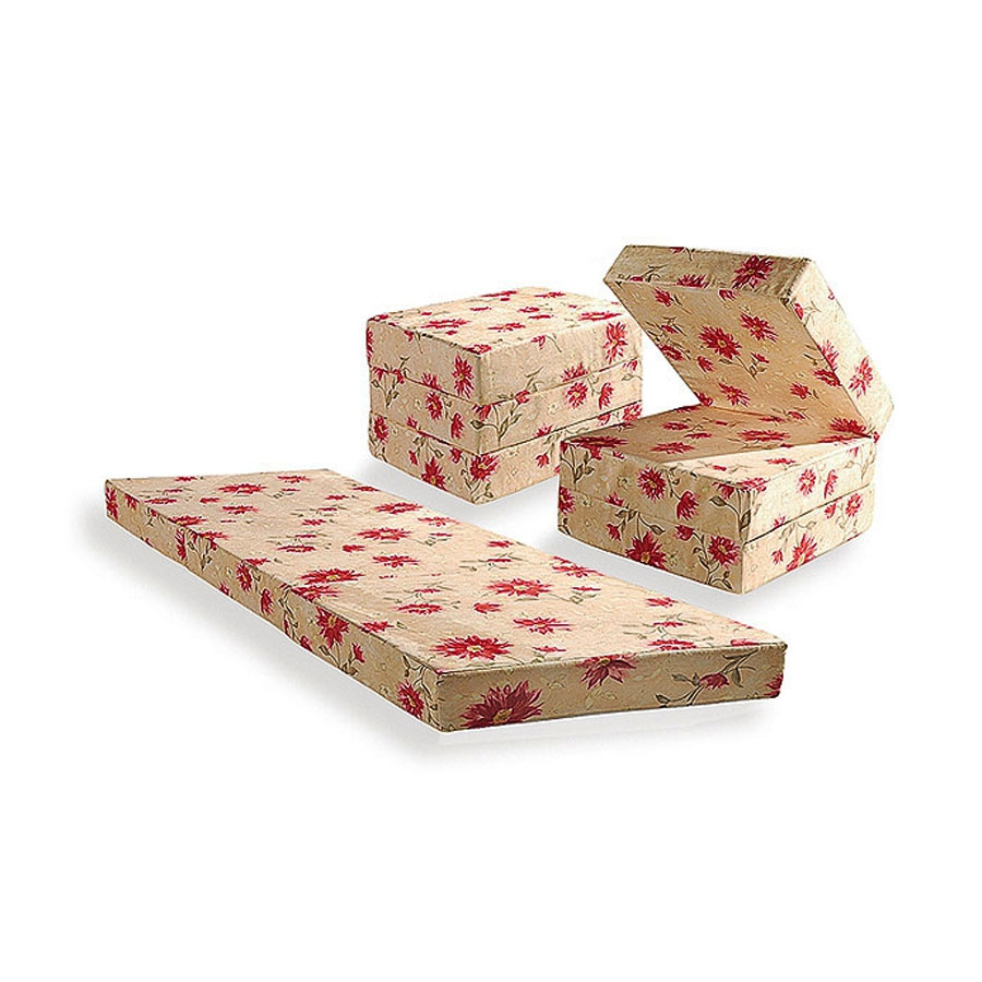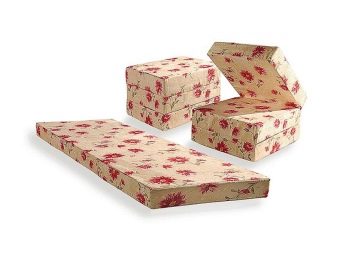 Kompakte Größe. Zusammengeklappt nimmt das Hockerbett wenig Platz ein, es kann in eine Ecke oder unter einen Tisch geschoben werden, damit es tagsüber nicht stört.