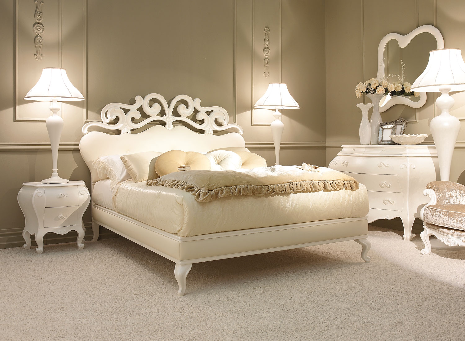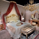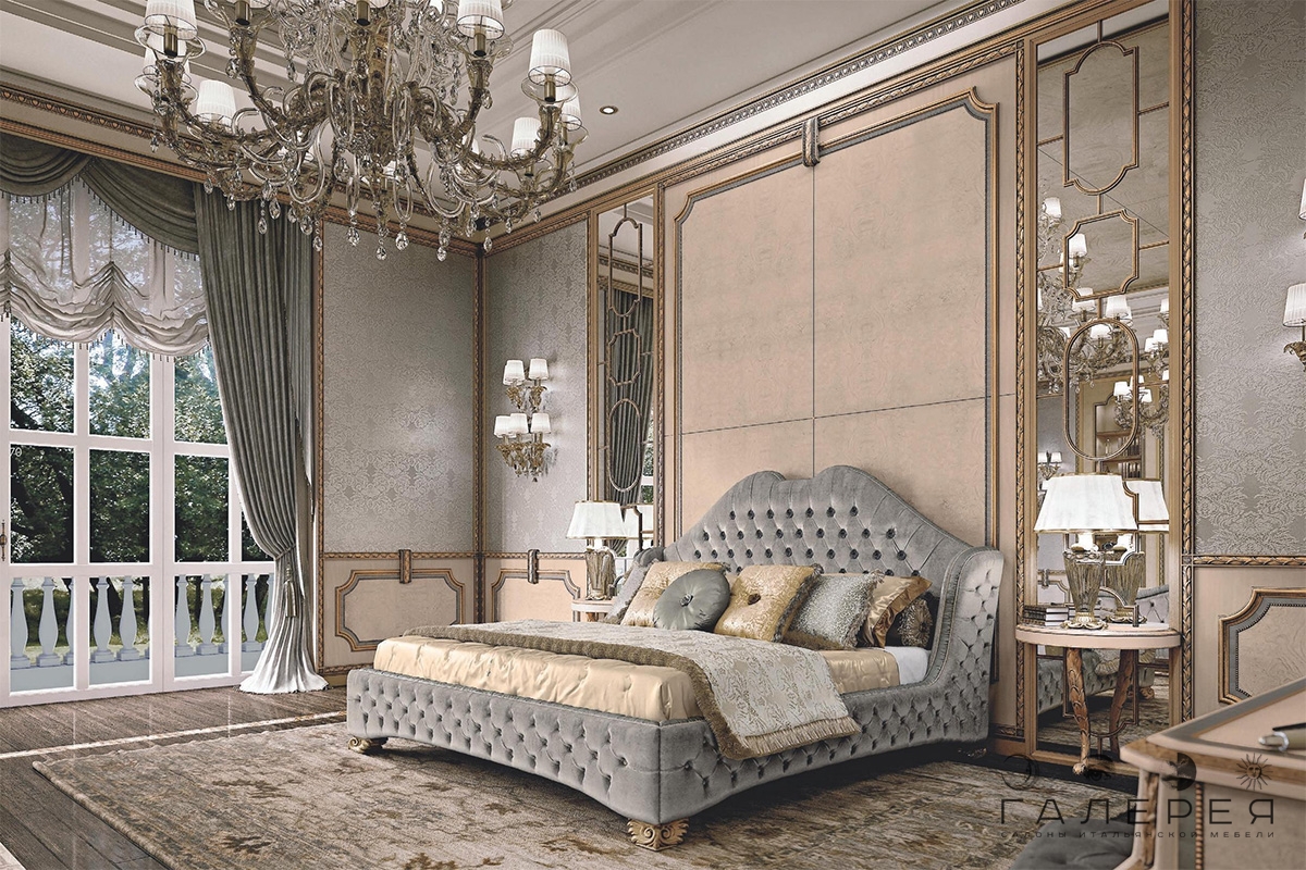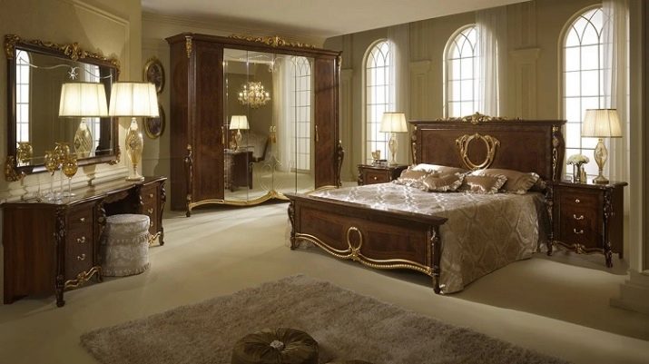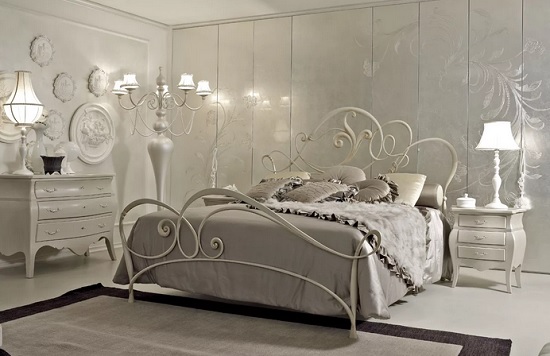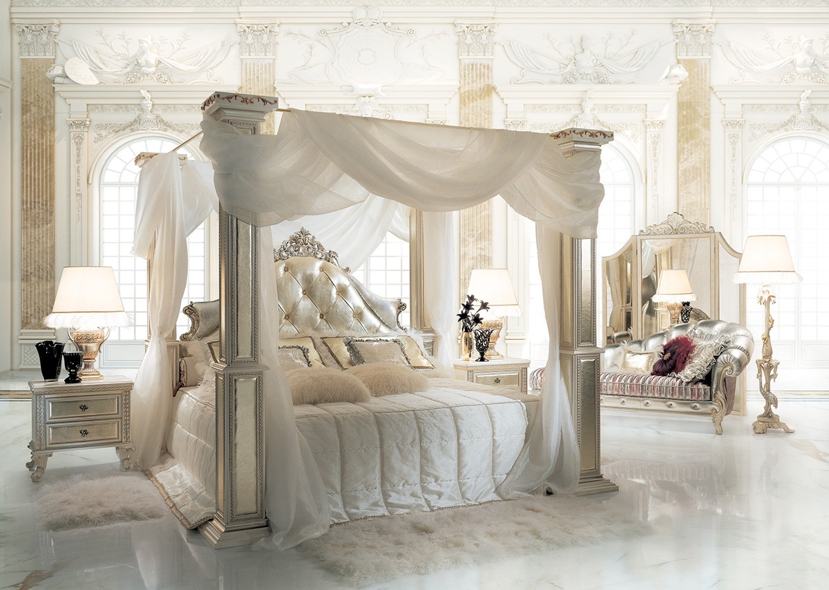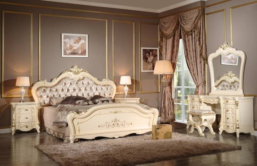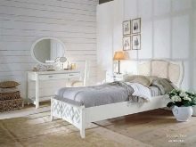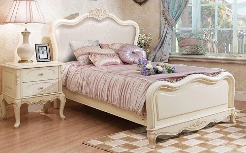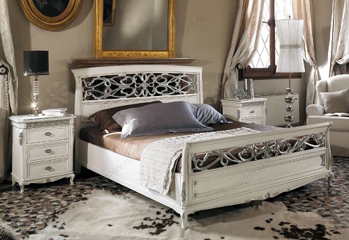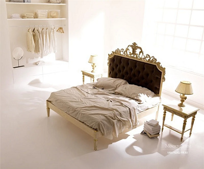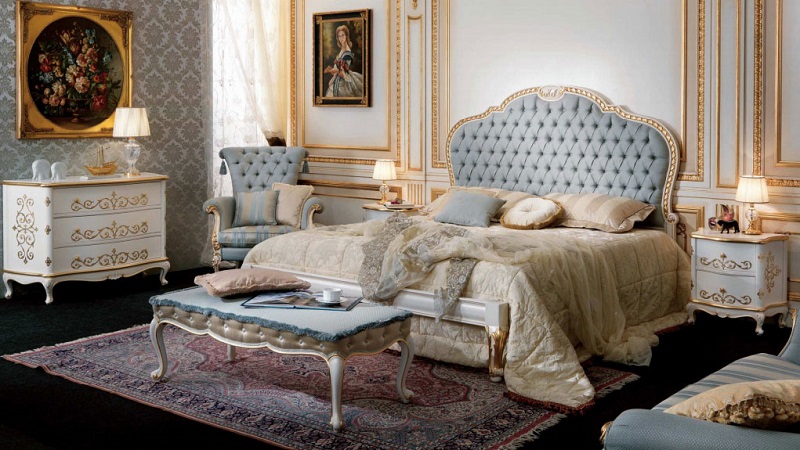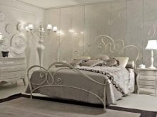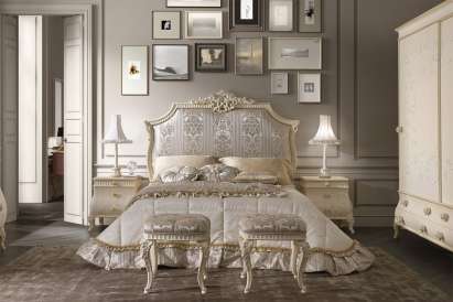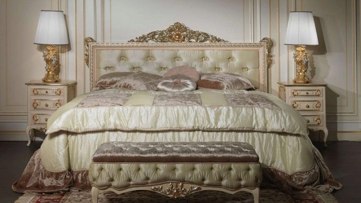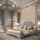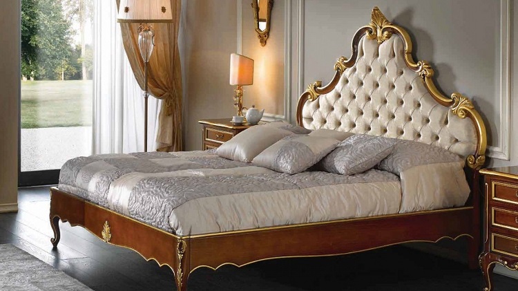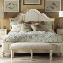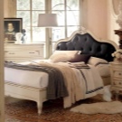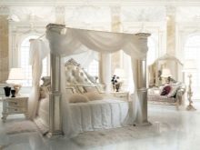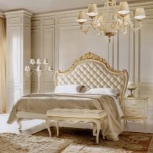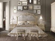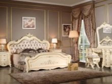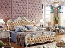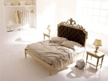 Das Kopfteil des Bettes muss über alle anderen Teile angehoben werden... Es sollte verwenden geschmiedete Gegenstände, Schnitzereien oder Malereien. Die schicksten Modelle sind verkrustet und mit Baldachinen ergänzt. Textilien aus strukturierten Stoffen passen perfekt zur Gesamtkomposition. Es ist aber auch unmöglich, die Sättigung übermäßig zu erhöhen, sonst sieht alles in seinem Bombast lächerlich und lächerlich aus.