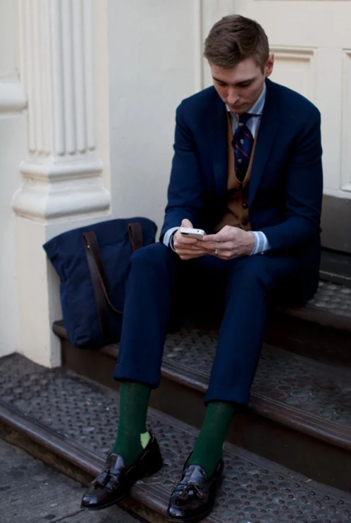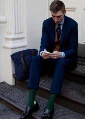 Socken müssen die gleiche Farbe wie der Anzug haben und eine Nuance heller als die Schuhe sein.... Wenn es keine solche Farbe gibt, sollten Sie sie unter einer Krawatte oder einem Gürtel tragen. Dies ist jedoch nur dann der Fall, wenn das Zubehör für andere sichtbar ist. Vergessen Sie auch nicht die Kombinationsregeln - kalte und warme Farben sollten niemals miteinander gemischt werden. Wenn das Kit braun ist oder seinen Farbton hat, dann Socken sollten eine Nuance dunkler oder grün genommen werden. Diese Kombination wird sehr reichhaltig aussehen.