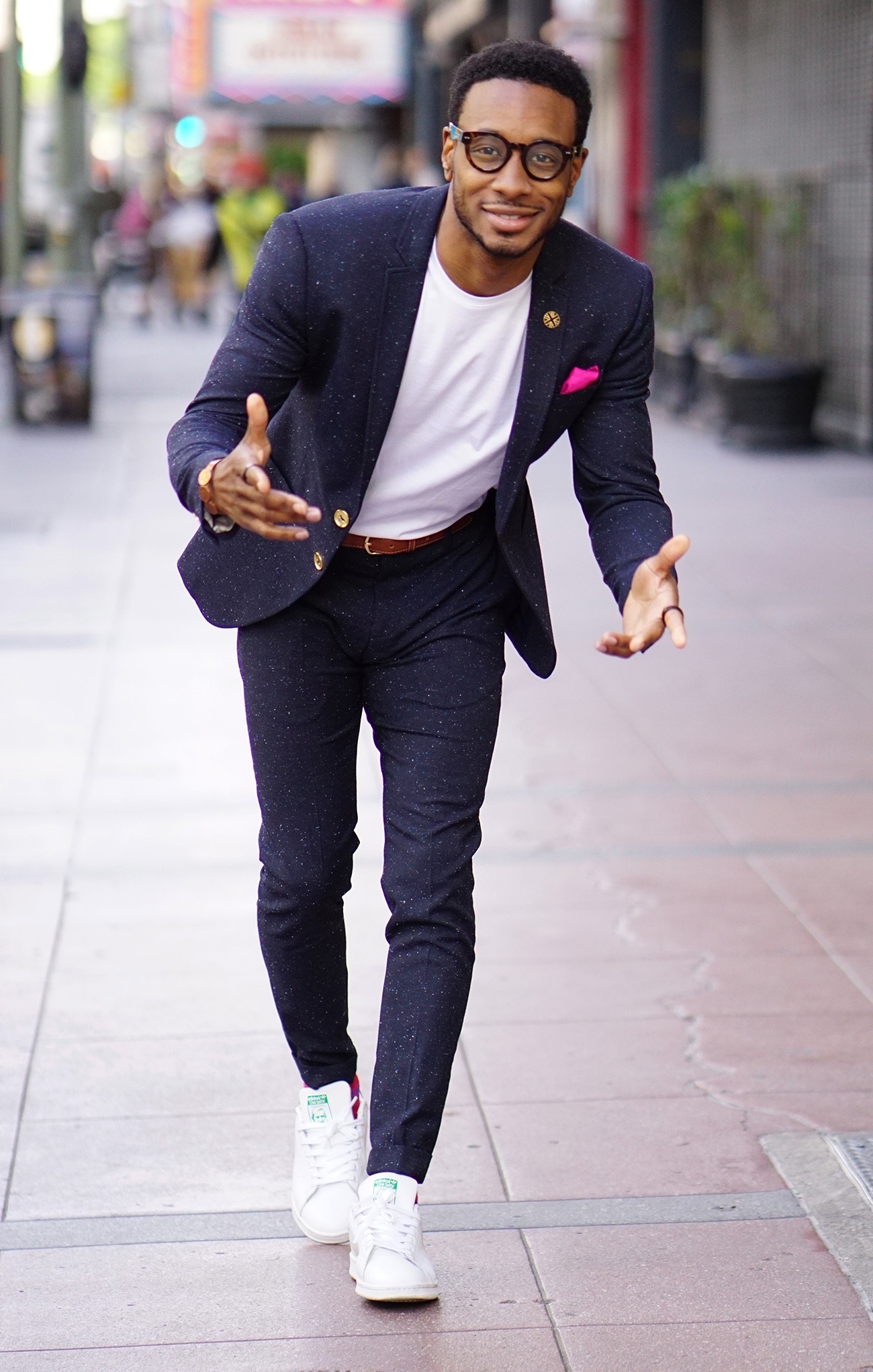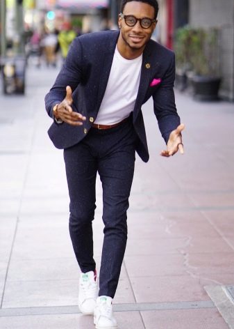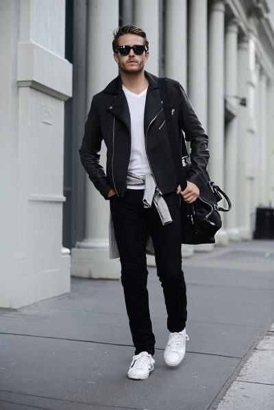 Für einen lässigen Look können Sie mittellange weiße Socken und keine massiven weißen Sneakers, Sneakers nehmen. Eine schlichte schwarze Hose oder schwarze Jeans, ein T-Shirt und eine Jacke in der gleichen Farbe passen gut und sorgen für einen total schwarzen Look. Unter den Accessoires können Sie einen Rucksack oder eine kleine Aktentasche wählen.