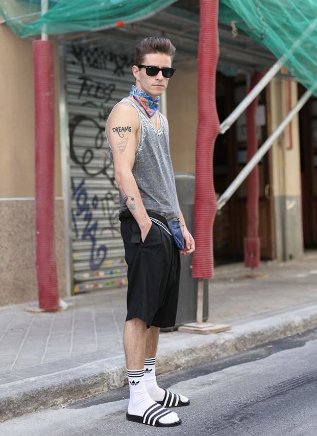 Für einen sportlichen Sommerlook kannst du schwarze Leggings oder Kniestrümpfe, schwarze Sneaker und leichte Shorts tragen.... Ein weißes T-Shirt und ein khakifarbenes Bandana verwässern den Look perfekt. Sie können auch mit einem schwarzen T-Shirt wieder einen total schwarzen Look kreieren. Wenn Sie ein T-Shirt tragen möchten, sollte es übergroß sein.